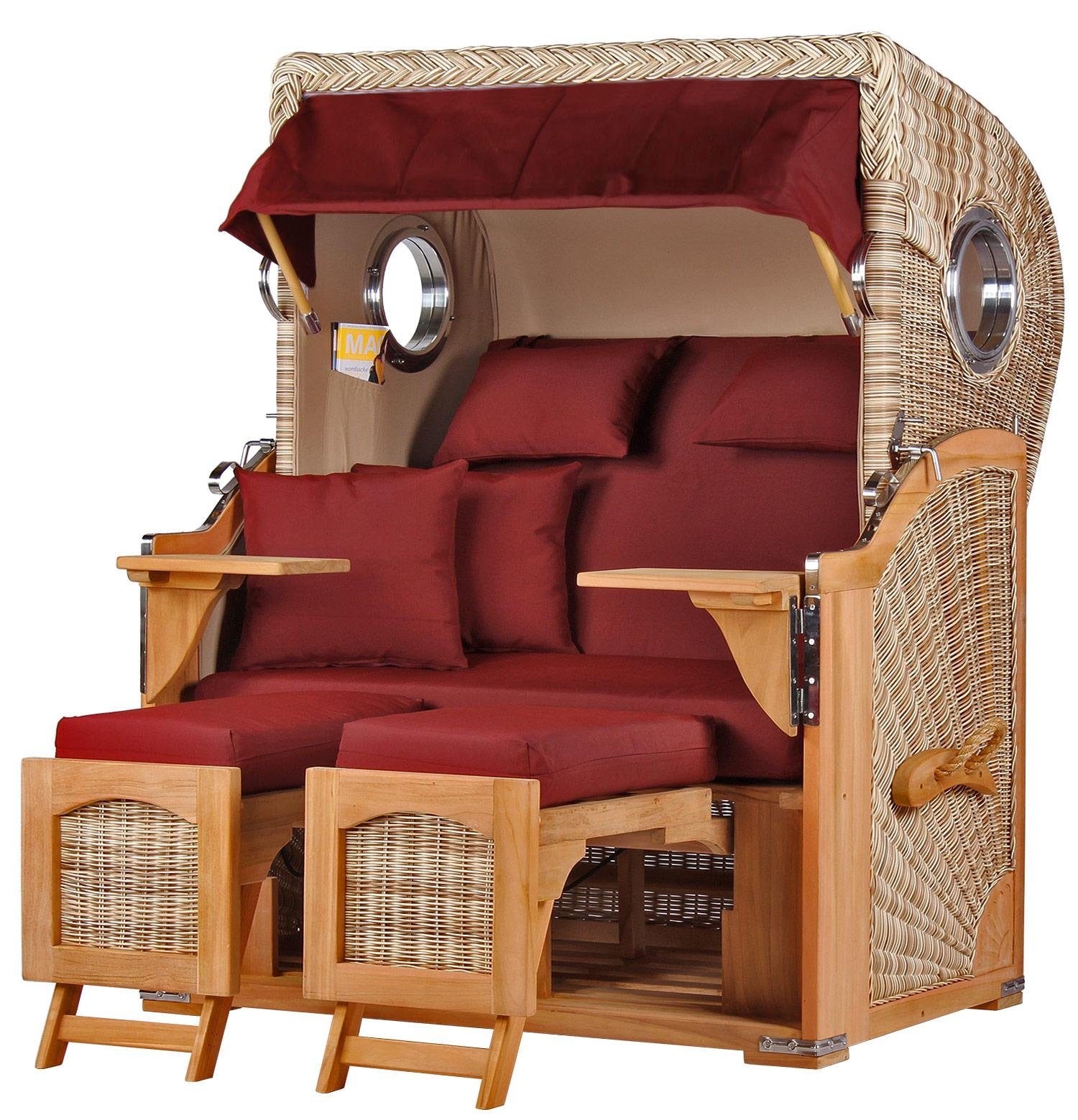 Lieferumfang | 1x Strandkorb-Korpus, 1x Sitzpolster, 1x Rückenpolster, 2x Wurfkissen, 2x Nackenkissen, 2x Fußpolster, 2x Fußstützen, 1x Sonnenmarkise, 2x Schwenktisch, montiertes Liftersystem |