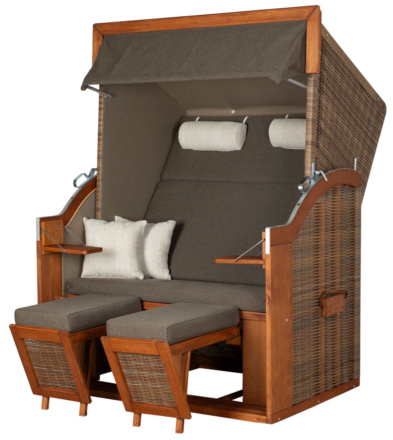 Das zeitlose Design des Strandkorbs kombiniert klassische Elemente des norddeutschen Küstenstils mit modernen Akzenten. Die harmonische Farbkombination aus natürlichen Holztönen und dezenten grau-braunem Geflecht sorgt für eine elegante Ausstrahlung, die sich nahtlos in jede Garten- oder Terrassenlandschaft einfügt. Die geschwungenen Linien des Korbs laden zum Verweilen ein und betonen die Gemütlichkeit, die dieser Strandkorb ausstrahlt. Das Design verkörpert die Leichtigkeit und Frische eines Strandbesuchs, während die hohen Seitenwände und das Dach ein Gefühl von Geborgenheit vermitteln.