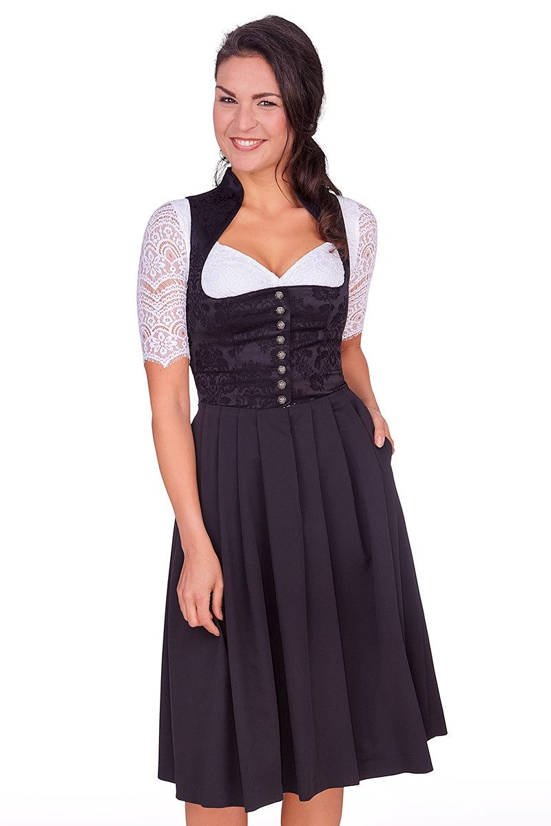 Dieses traumhafte, vielseitige Midi Dirndl namens Gesina in Schwarz hat ein exquisites Mieder aus umwerfendem Jacquard und einen wadenlangen, fließenden Rock. Das sauber abgefütterte Mieder-Oberteil mit dem bezaubernden, floralen Ornamentik-Webmuster, wobei der Untergrund dezent glänzt und die Motive matt sind, wird durch den stilvollen Schneewittchenkragen in Kombination mit einem Balconette-Ausschnitt und der schönen Knopfleiste perfekt. Die fabelhaften, silbernen Kugel-Ösenknöpfe im zarten, filigran geriffelten Ajour-Ornamentik-Design ergänzen das Dirndl perfekt. Komplettiert wird es durch den knitterfreien Rock aus angenehm fließendem Material, der in schöne Kellerfalten gelegt ist und beidseitig über Eingrifftaschen verfügt. Das herrliche Trachtenkleid ist auch prima als Gastrodirndl geeignet. Im Lieferumfang ist das Dirndl ohne Schürze enthalten. Bitte beachten Sie den Größenzuschlag ab Розмір 48.