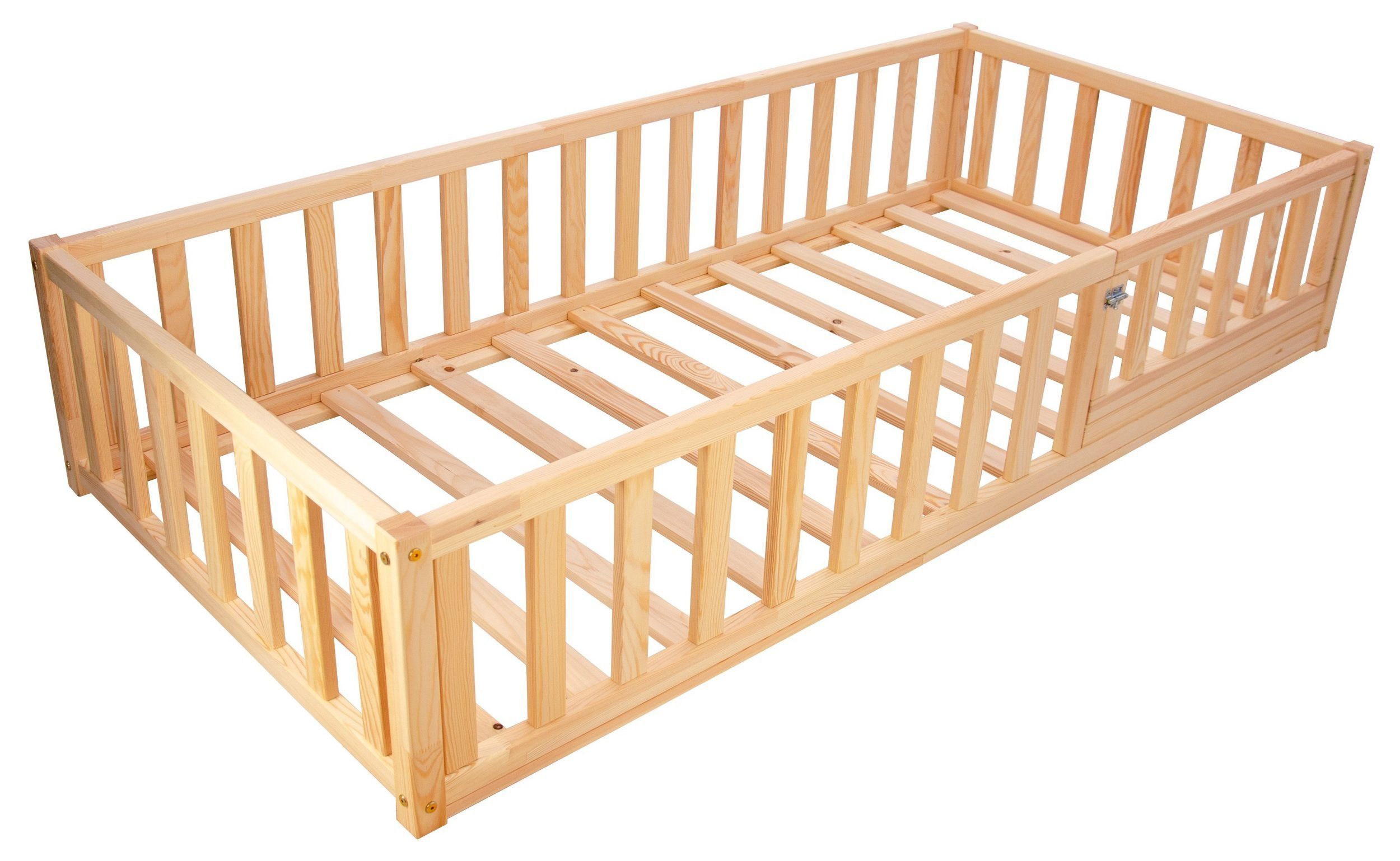 Das Kinderbett ist bodentief. Die Matratzengröße ist 90x200x10 cm (BxLxT). Das Kinderbett verfügt über 38,5 cm hohe Sicherheitsbarrieren rund um das Bett und eine 77 cm breite Tür. Die Tür ist mit einem Schloss ausgestattet und sorgt für besonders viel Entdeckungsspaß in eigenem Kinderzimmer. Im Lieferumfang ist ein Lattenrost, bestehend aus 12 Latten (5 cm breit) enthalten.