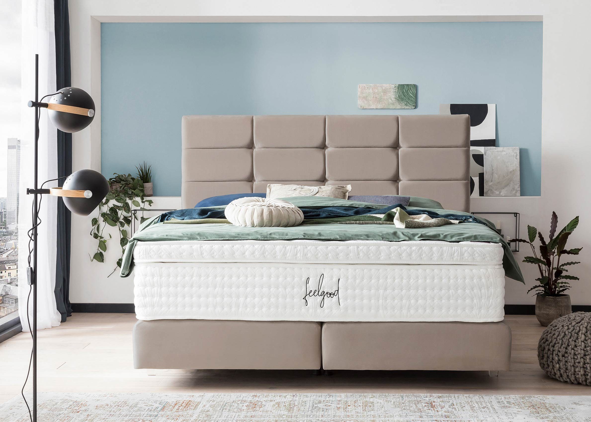 Ausstattung | 7-Zonen Taschenfederkern-Matratze Kopfteil auch hinten mit echtem Stoff bezogen Acryl-Füße Taschenfederkern-Unterbox |