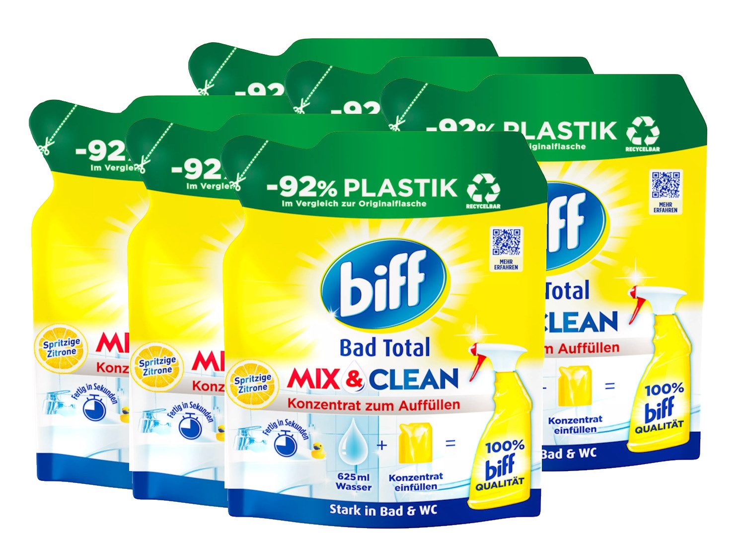Biff Bad Total Mix & Clean Spritzige Zitrone zum Auffüllen – Stark in Bad und WC Das BIFF Bad Total Bad- und Fliesenreiniger beseitigt selbst hartnäckige Kalk- und Wasserflecken, Seifenreste, Badezusätze sowie sonstigen Schmutz kraftvoll und mühelos. Ohne zu scheuern, für strahlenden und dauerhaften Glanz. Der Haushaltsreiniger sorgt für hygienische Sauberkeit im ganzen Badezimmer, kann auf allen Oberflächen angewendet werden* und verbreitet einen angenehmen Duft nach spritziger Zitrone. Der Nachfüllbeutel enthält 92 % weniger Plastik im Vergleich zur Originalflasche und ist recycelbar. Die Produktvorteile im Detail: Bad- und Duschreiniger Konzentrat zum Auffüllen Hygienische Sauberkeit Kraftvoll gegen Kalk & Verschmutzungen Für alle Oberflächen* -92 % Plastik im Vergleich zur Originalflasche Recycelbare Verpackung Spritziger Duft * Nicht auf Marmor und Kalkstein anwenden. Bei emaillierten Badewannen zunächst an einer unauffälligen Stelle ausprobieren. Kachelfugen vor Anwendung mit Wasser anfeuchten und bis zu 5 Min. einwirken lassen. Anwendung: 1. Befüllen: Befüllen Sie die original BIFF 750 ml Flasche bis zur aufgedruckten Markierung mit Leitungswasser.2. Hinzufügen: Fügen Sie den gesamten Beutelinhalt BIFF Badreiniger Konzentrat hinzu.3. Verschließen: Verschließen Sie die Flasche durch Herunterdrücken und gleichzeitige 1/4-Drehung des Sprühkopfes im Uhrzeigersinn. Flasche im Anschluss vorsichtig schütteln. Die Marke Biff Strahlende Sauberkeit im gesamten Bad. BIFF zeichnete sich mit seinen Produkten schon immer durch hygienische Sauberkeit, einer hohen Kalklösekraft und dem Verleih von strahlendem Glanz aus. BIFF entfernt Kalk und Schmutz im gesamten Badezimmer – sogar das WC kann mit BIFF gereinigt werden.