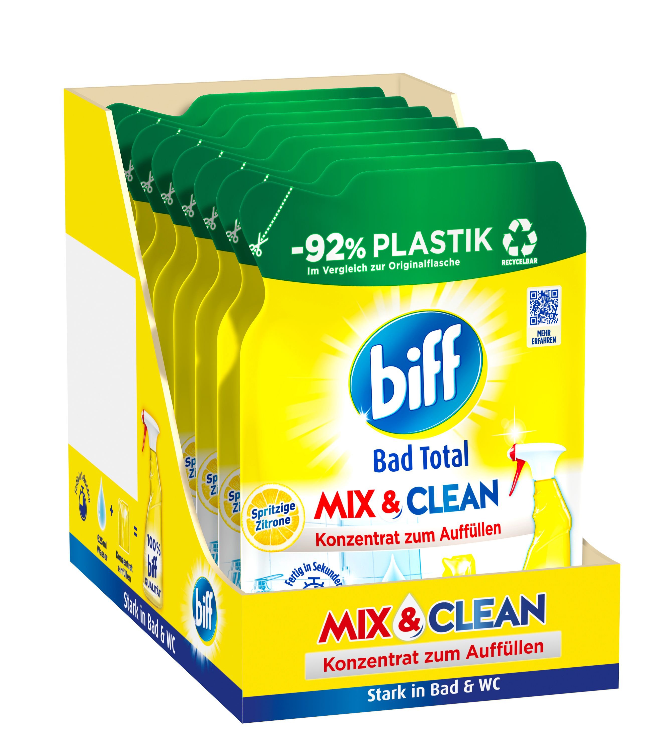 Biff Bad Total Mix & Clean Spritzige Zitrone zum Auffüllen – Stark in Bad und WC Das BIFF Bad Total Bad- und Fliesenreiniger beseitigt selbst hartnäckige Kalk- und Wasserflecken, Seifenreste, Badezusätze sowie sonstigen Schmutz kraftvoll und mühelos. Ohne zu scheuern, für strahlenden und dauerhaften Glanz. Der Haushaltsreiniger sorgt für hygienische Sauberkeit im ganzen Badezimmer, kann auf allen Oberflächen angewendet werden* und verbreitet einen angenehmen Duft nach spritziger Zitrone. Der Nachfüllbeutel enthält 92 % weniger Plastik im Vergleich zur Originalflasche und ist recycelbar. Die Produktvorteile im Detail: Bad- und Duschreiniger Konzentrat zum Auffüllen Hygienische Sauberkeit Kraftvoll gegen Kalk & Verschmutzungen Für alle Oberflächen* -92 % Plastik im Vergleich zur Originalflasche Recycelbare Verpackung Spritziger Duft * Nicht auf Marmor und Kalkstein anwenden. Bei emaillierten Badewannen zunächst an einer unauffälligen Stelle ausprobieren. Kachelfugen vor Anwendung mit Wasser anfeuchten und bis zu 5 Min. einwirken lassen. Anwendung: 1. Befüllen: Befüllen Sie die original BIFF 750 ml Flasche bis zur aufgedruckten Markierung mit Leitungswasser.2. Hinzufügen: Fügen Sie den gesamten Beutelinhalt BIFF Badreiniger Konzentrat hinzu.3. Verschließen: Verschließen Sie die Flasche durch Herunterdrücken und gleichzeitige 1/4-Drehung des Sprühkopfes im Uhrzeigersinn. Flasche im Anschluss vorsichtig schütteln. Die Marke Biff Strahlende Sauberkeit im gesamten Bad. BIFF zeichnete sich mit seinen Produkten schon immer durch hygienische Sauberkeit, einer hohen Kalklösekraft und dem Verleih von strahlendem Glanz aus. BIFF entfernt Kalk und Schmutz im gesamten Badezimmer – sogar das WC kann mit BIFF gereinigt werden.
