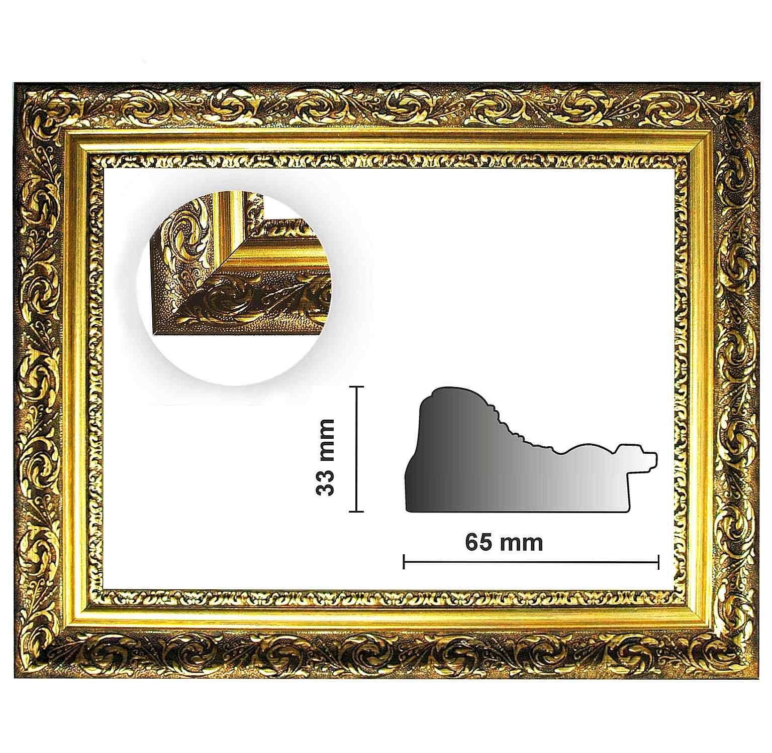 Barockrahmen BA1090, gold fein verziert, Serie 840 ORO. Als Zuschnitt, Leerrahmen oder Wechselrahmen erhältlich. Dieser goldene Barockrahmen BA1090 besitzt ein Profil von 33 mm Höhe und 65 mm Breite. Der Bilderrahmen im Barock-Stil ist hier als Zuschnitt mit Gehrung, als Leerrahmen und Wechselrahmen mit Kunstglas erhältlich. Als Rahmen gefertigt werden zur Stabilisierung an den Ecken Metallwinkel eingearbeitet. Zur Erläuterung:- Zuschnitt: Profilleisten sind auf Gehrung geschnitten und nicht zusammengefügt - Leerrahmen: Profilleisten sind auf Gehrung geschnitten und zusammengefügt - Wechselrahmen: Profilleisten sind auf Gehrung geschnitten, zusammengefügt und werden mit Glas, Rückwand, Aufhängung und angestanztem Einlegeblatt komplettiert. Barockbilderrahmen eignen sich klassisch im barocken Ambiente, aber auch, um mit Gegensätzen zu spielen. Zum Beispiel verwendet man moderne Farben, gepaart mit einem barocken Goldrahmen. Dies ergibt eine interessante Kombination aus den Gegensätzen von klassisch und modern. Für Maße, die hier nicht angeboten werden, fragen Sie uns bitte an. Wir als Hersteller können Ihnen jedes Maß liefern.