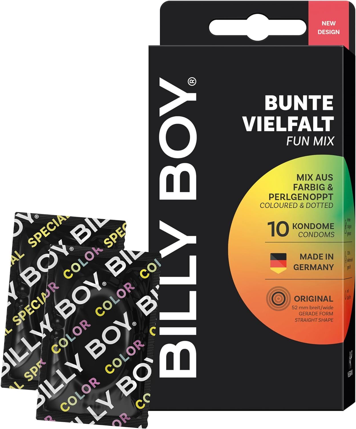 EUER MIX: Mit dem 10er Bunte Vielfalt Mix von BILLY BOY liebt ihr euch abwechslungsreich, bunt und aufregend - mehr Spaß beim Sex mit genoppten Kondomen und Kondomen mit aufregenden Farben.