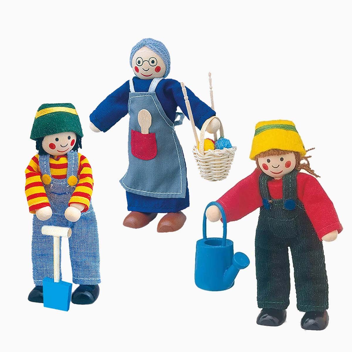 Informationen zur Lieferung | Set enthält: 3 Biegepuppen (Julia, Jan, Oma) mit Zubehör (Gießkanne, Spaten, Körbchen) |