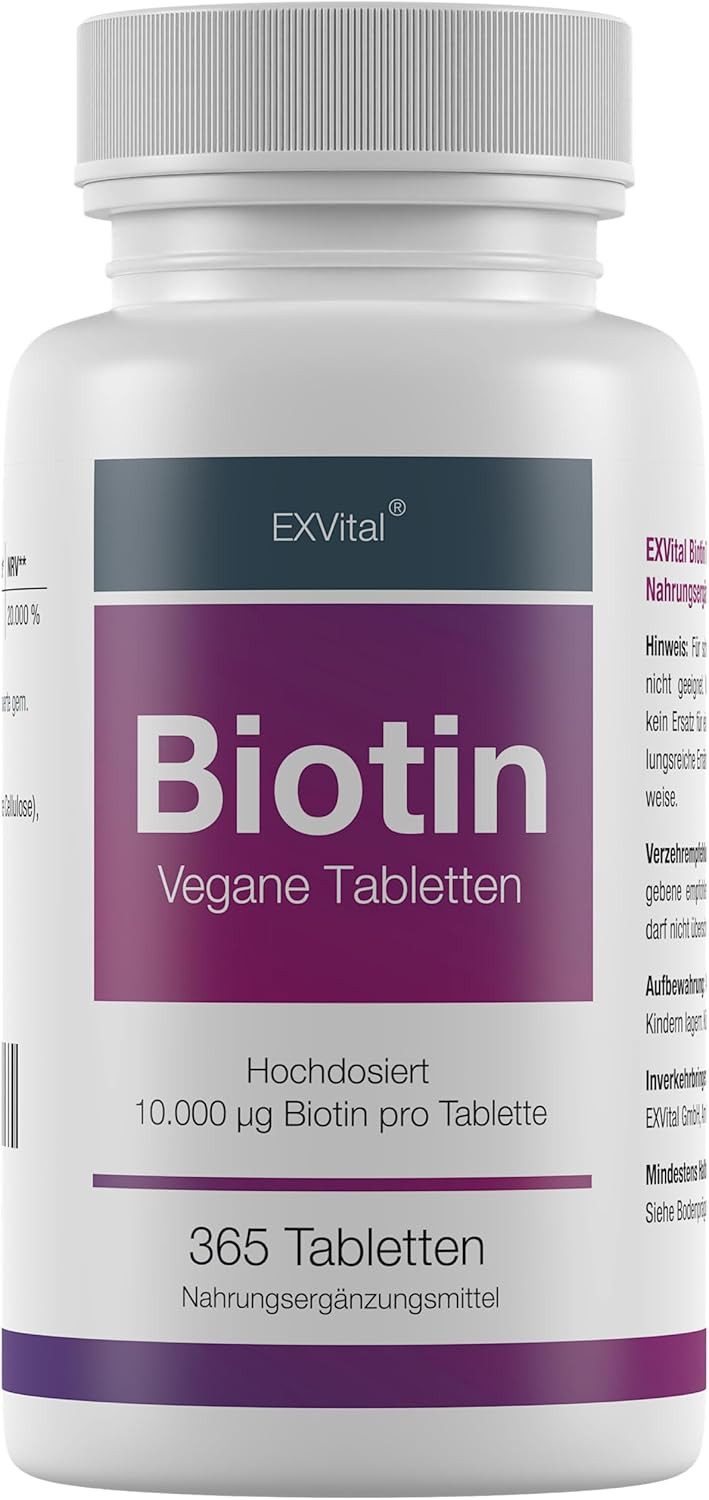 EXVITAL BIOTIN: Bereits mit einer Tablette erreichen Sie schon das Tagesmaximum von 10.000 mcg Biotin, 365 Tabletten pro Dose reichen somit für ein ganzes Jahr (bei einer Tablette am Tag) – Unser Produkt ist somit sehr ergiebig im Vergleich mit anderen Produkten. Sie erhalten eine clevere Jahrespackung. Biotin hat folgende Wirkungen: - trägt zu einem normalen Energiestoffwechsel bei - trägt zur Erhaltung normaler Haut bei - trägt zur Erhaltung normaler Schleimhäute bei - trägt zur Erhaltung normaler Haare bei - trägt zur normalen psychischen Funktion bei - trägt zu einem normalen Stoffwechsel von Makronährstoffen bei - trägt zu einer normalen Funktion des Nervensystems bei EXVital Biotin ist sowohl für Frauen als auch für Männer geeignet. Für eine optimale Versorgung empfehlen wir Ihnen 1 Tablette täglich mit reichlich Wasser einzunehmen. Unser Biotin ist für eine dauerhafte Einnahme geeignet. 100% VEGAN UND FREI VON ZUSATZSTOFFEN: EXVital Biotin ist zu 100% vegan und frei von unnötigen Zusatzstoffen und somit bestens geeignet für Veganer und Vegetarier und Всіrgiker. VERZEHR: Wir empfehlen 1 Tablette täglich mit reichlich Wasser einzunehmen. Unser Biotin ist zum dauerhaften Verzehr geeignet und wir empfehlen die regelmäßige Einnahme von mindestens 4 bis 5 Monate. QUALITÄT: Всі unsere Produkte werden in Deutschland nach besten Qualitäts- und Sicherheitsstandards hergestellt.Unsere Produktion ist ISO 9001, HACCP und GMP zertifiziert. Wir lassen unsere Produkte zusätzlich von unabhängigen Laboren prüfen. Wir achten bei unseren Produkten auf eine sehr gute Verträglichkeit und hohe Bioverfügbarkeit.
