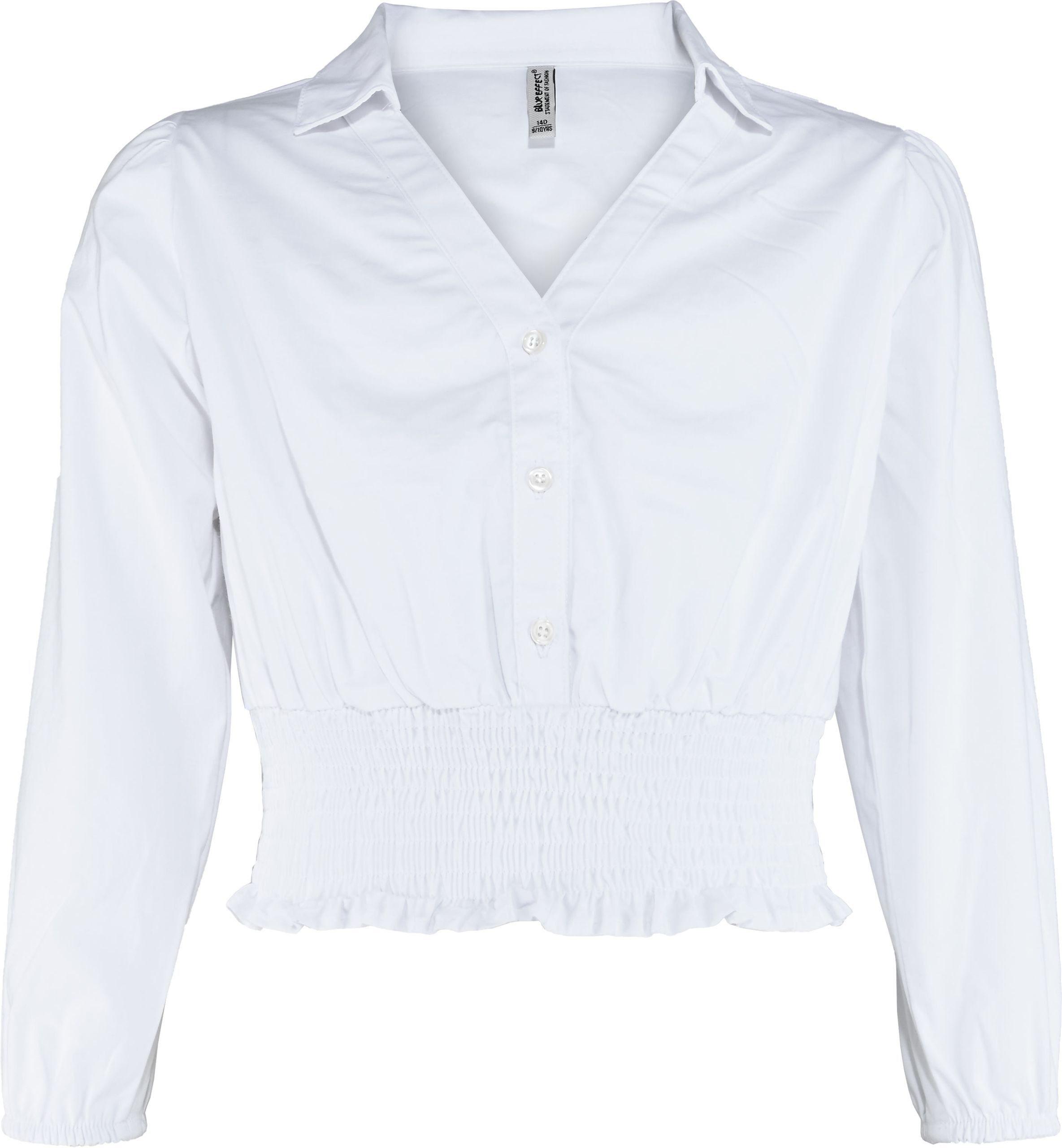 Diese elegante Mädchenbluse von Blue Effect in klassischem Weiß ist ideal für besondere Anlässe wie Kommunionen, Jugendweihen und festliche Feiern. Sie kombiniert Stil mit Funktionalität durch eine praktische Knopfleiste, einen traditionellen Kragen und lange Ärmel. Der kurze Schnitt und der gesmokte Saum im Taillenbereich betonen die kindgerechte Silhouette und bieten gleichzeitig Komfort und Bewegungsfreiheit. Gefertigt aus einem pflegeleichten Polyester-Baumwollgemisch, ist diese Bluse nicht nur optisch ansprechend, sondern auch langlebig und hautfreundlich, ideal für den Alltag und spezielle Anlässe.
