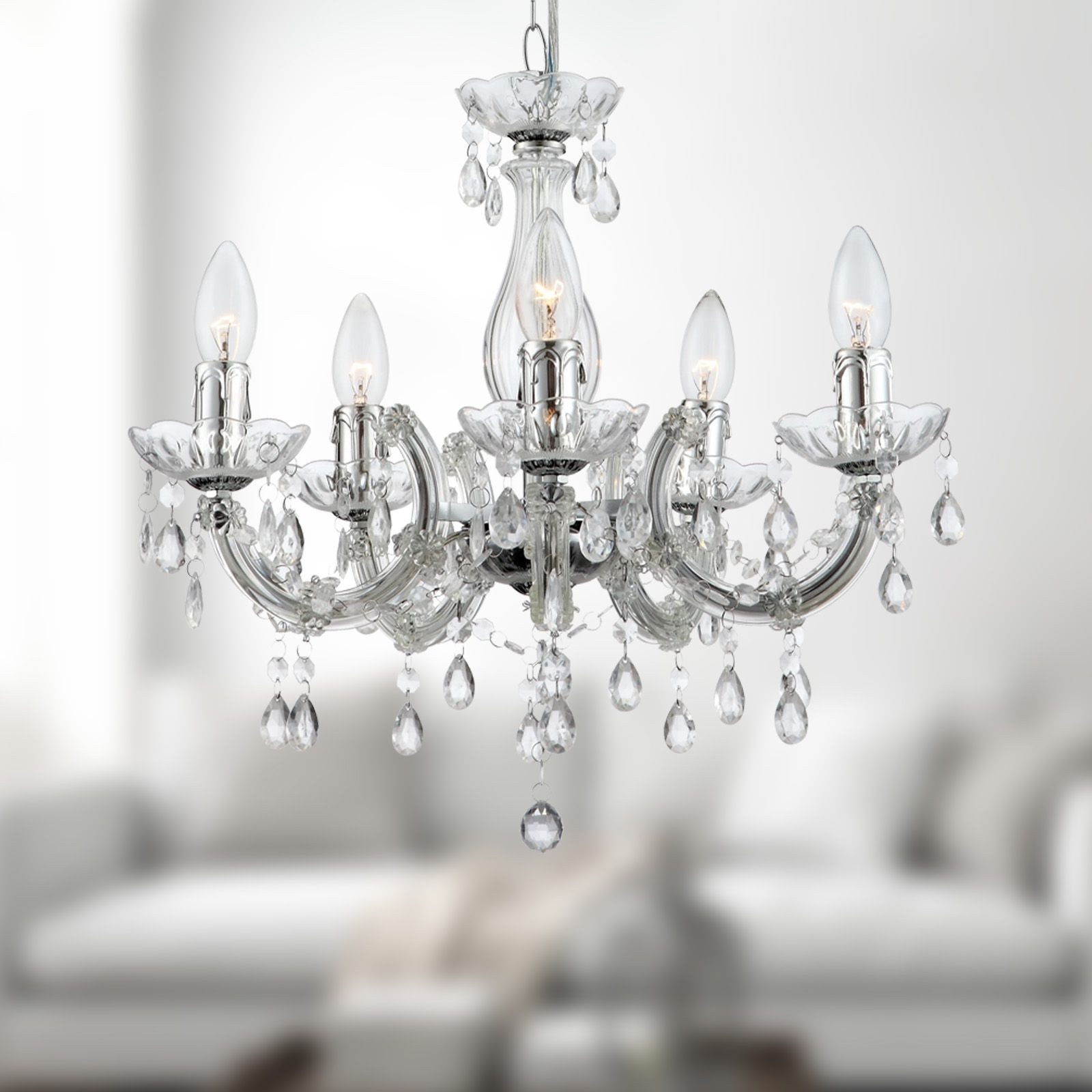 Durch die verchromten Bestandteile und das klare Glas kommt dieser Luster sehr gut zur Geltung und erstrahlt Ihre Räume in einem besonderen Glanz. Die eingebauten E14 Fassungen ermöglichen Ihnen die Wahl eines Leuchtmittels (max. 40W).