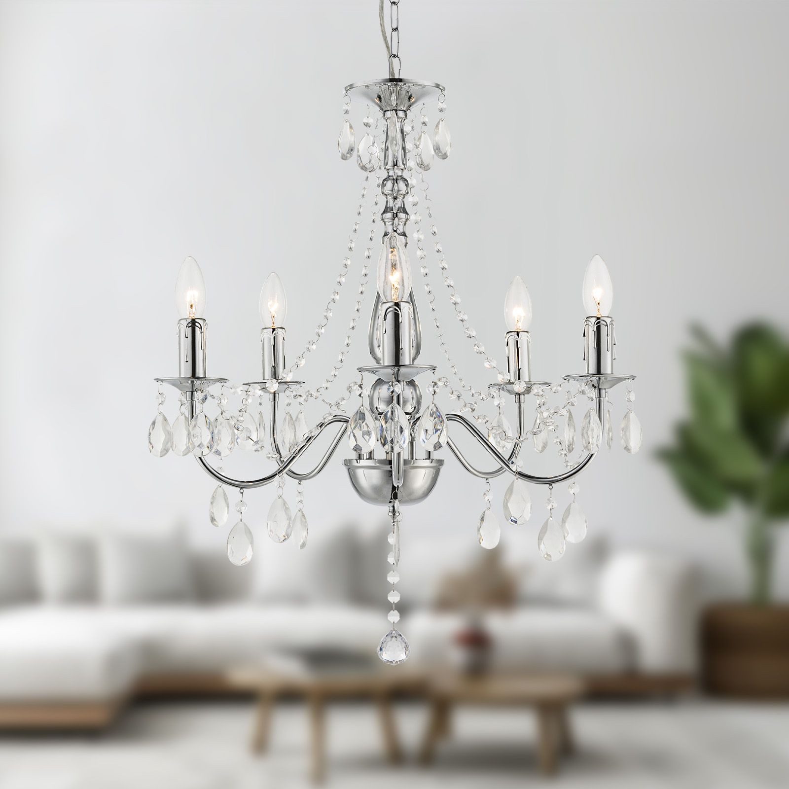 Wissenswertes | KRONLEUCHTER - KRISTALLE - CHROM Der opulente Luster besticht mit seiner eleganten Optik. Durch die klaren, herunterhängenden Acrylkristalle wird das Gesamtbild noch zusätzlich aufgewertet. Die klaren Acrylkristalle sorgen für funkelnde Lichtreflexionen und schaffen eine glamouröse Atmosphäre. Die Höhe des Kronleuchters ist kürzbar, sodass er sich ideal an unterschiedliche Raumhöhen anpassen lässt. Diese Lampe verfügt über fünf E14 Fassungen, welche, bis zu einer maximalen Leistung von 40 Watt pro Vorrichtung, frei bestückt werden können. Genießen Sie die stilvolle Beleuchtung und die luxuriöse Ausstrahlung, die der Kronleuchter in Ihr Zuhause bringt. Er ist die perfekte Wahl für elegante Esszimmer, Wohnräume oder Flure und verwandelt jeden Raum in ein stilvolles Ambiente. Setzen Sie mit diesem Luster glanzvolle Akzente in Ihrem Zuhause. |