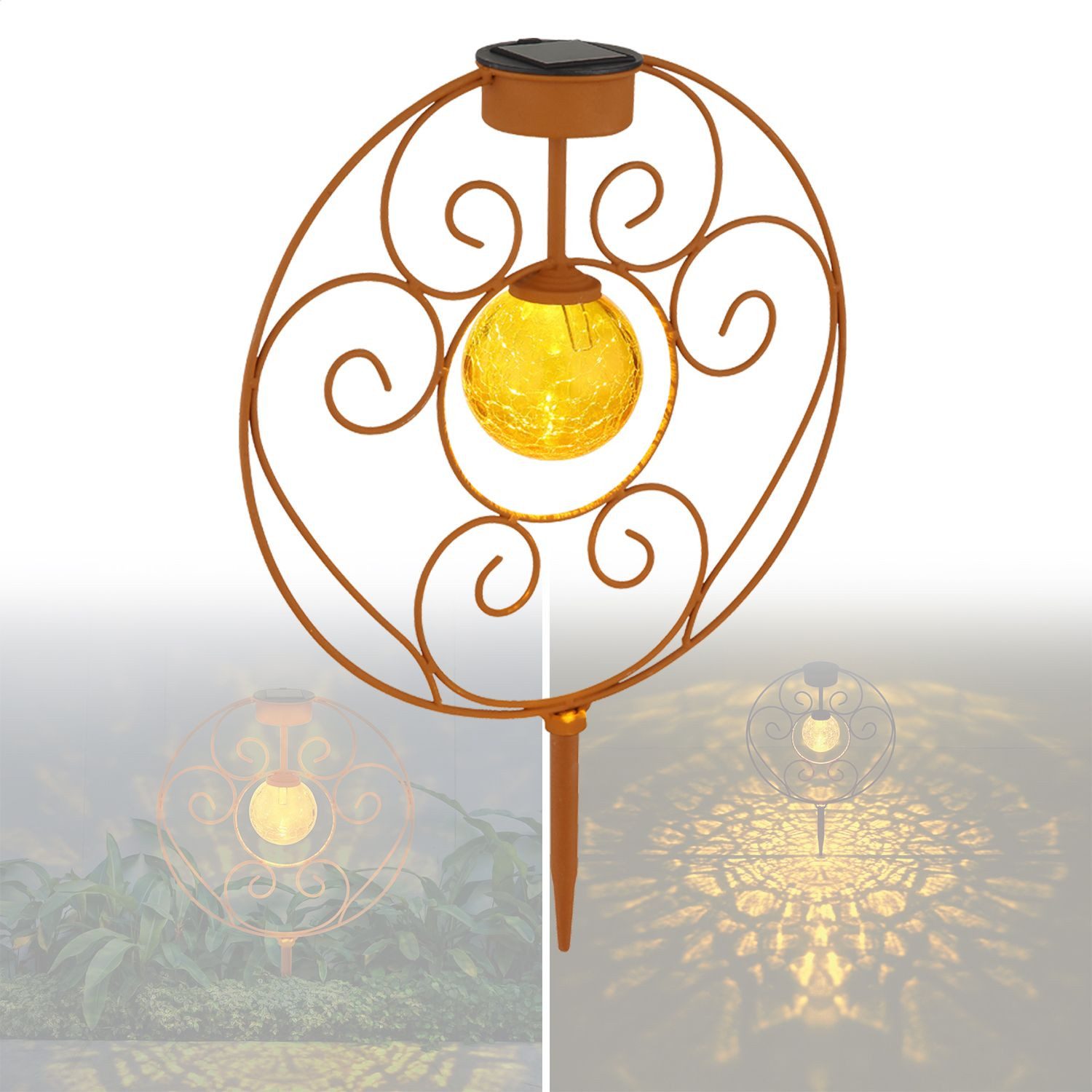 Wissenswertes | SOLARLEUCHTE - METALL ROSTFARBEN - GLAS AMBER CRACKLE - INKL. PFLEGETUCH Diese schöne Solarleuchte für den Außenbereich in Rostfarben begeistert durch Ihr tolles Design. Diese 41cm große Leuchte besteht aus einer flachen Metallscheibe mit Dekor bögen, einer schönen Glaskugel und einem Erdspitz. Eine tolle Gartenleuchte. Ein 3000 Kelvin warmweißes Licht sorgt für eine angenehme Atmosphäre und ist durch den IP44 Schutzgrad Spritzwasser geschützt. |