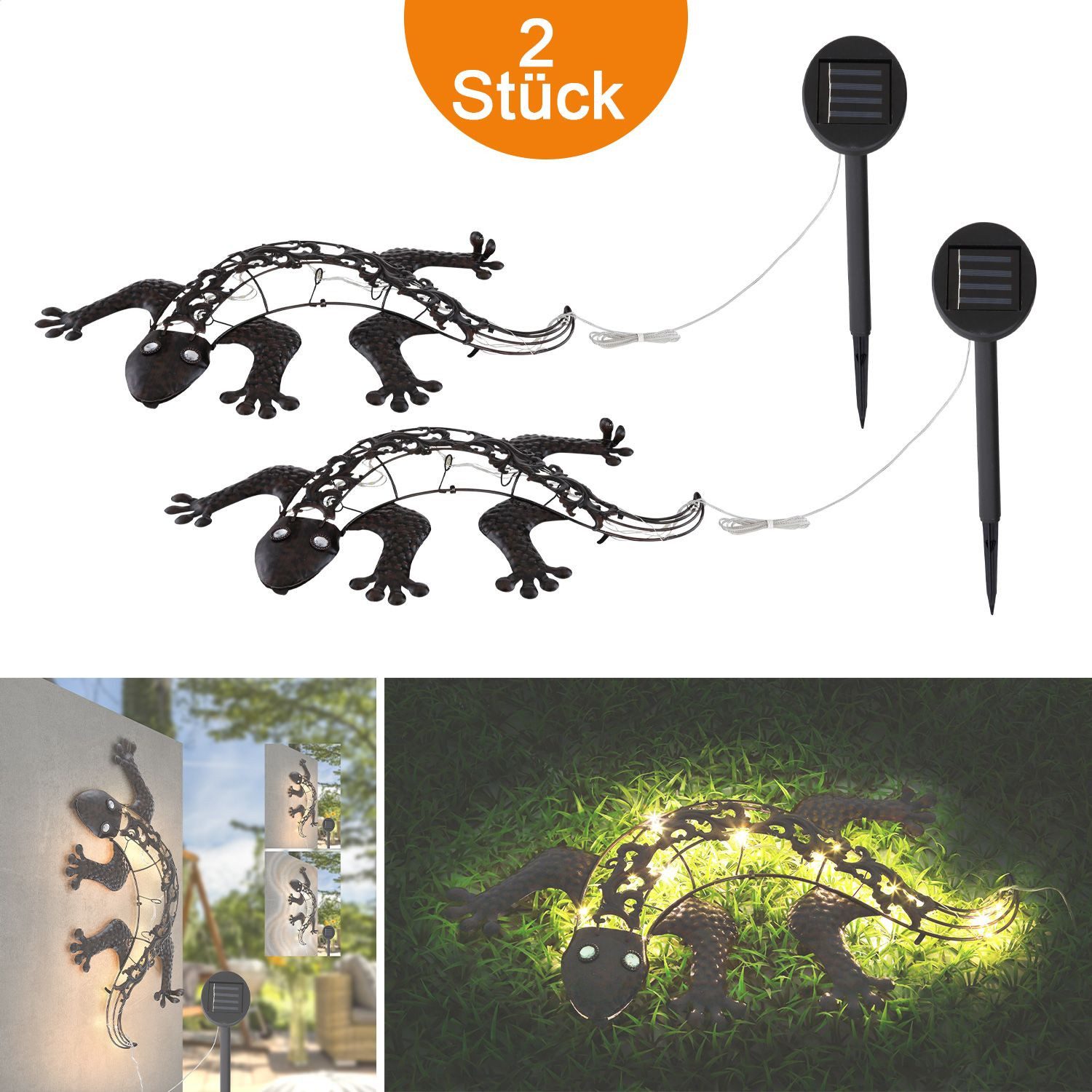 Wissenswertes | 2er Set Solarlampe Echse Gecko 25X LED SOLARLEUCHTE - METALL BRONZEFARBEN - KUNSTSTOFF SATINIERT Diese metallene Solar Außenlampe in Echsenoptik beinhaltet 25 LED-Leuchtmittel, die Ihren Garten oder Ihre Terrasse wunderschön in Szene setzen können. Die 50 cm lange kann sowohl auf Wänden als auch auf ebenen Flächen (z.B. in der Wiese) platziert werden. Die Solarzellen sind mittels Kabel mit der Solarleuchte verbunden und können mithilfe der Erdspitze in weichen Untergrund verankert werden. Zwei tolle Gartenleuchten. Die LED-Leuchtmittel spenden angenehm warmweißes Licht von 3000 Kelvin, wodurch Sie in Ihrem Außenbereich zusätzlich für eine stimmungsvolle Atmosphäre sorgen können. |