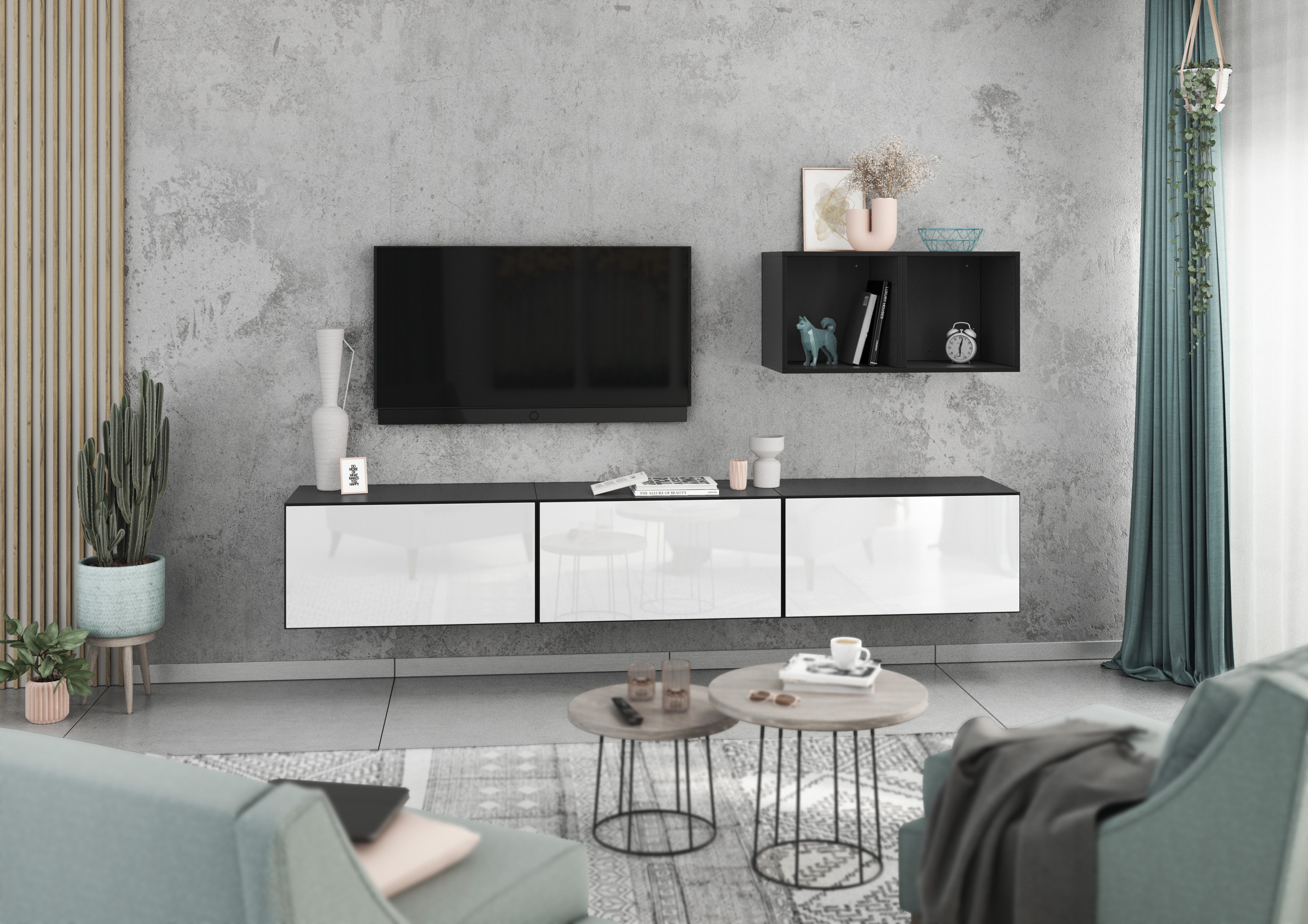 Lieferumfang | Sideboard bestehend aus 3 Einzelschränken Wandregal bestehend aus 2 Würfelregalen |