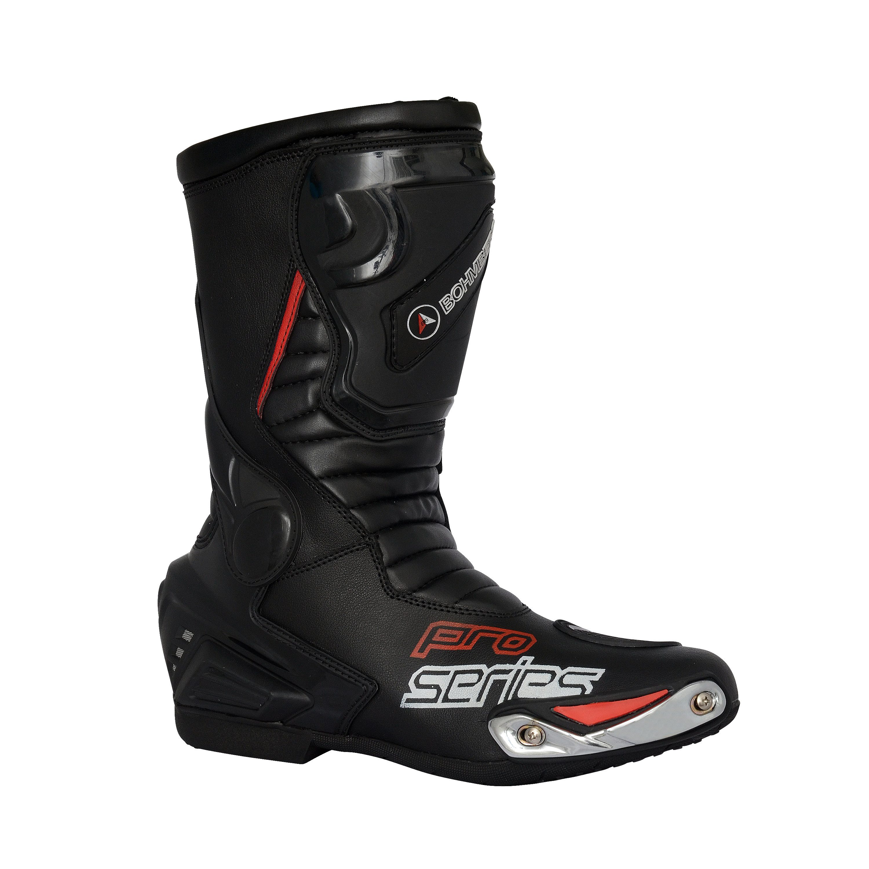 Der PRO SERIES Stiefel zeichnet sich durch seinen extra großen Zehenschleifer aus Metall aus und durch sehr gute Atmungsaktivität. Gut platzierte Rotakzente tragen zur Attraktivität bei. Das Obermaterial des PRO-SERIES Motorradstiefels besteht aus PU beschichtetem Leder. Er wird mit einem seitlichen Reißverschluss geöffnet der aus Schutz vor Feuchtigkeit zusätzlich mit einem Klettverschluss überdeckt ist. Der Stiefel hat neben einer Knöchelverstärkung auch eine Schaltverstärkung im Fußbereich und einen extra straken und stabilen Schleifer aus Metall. Außerdem besticht er durch sein sehr progressives und sportliches Design. Ein anatomisch und ergonomisch profilierter Sportstiefel, der sowohl für die Rennstrecke als auch für die Straße geeignet ist. Ausgezeichneter Schutz gepaart mit Komfort und Leichtigkeit. Neue Gummimischung für die Sohle sorgt für hohe Rutschfestigkeit auf dem Motorrad und auf dem Boden. Ein gelungener Stiefel von BOHMBERG im perfekten Preis-Leistungs-Verhältnis. Überzeugen Sie sich selbst. DETAILS * Futter: atmungsaktive Membran für maximale Flexibilität und Strapazierfähigkeit * Stiefelhöhe 32 cm * Komfortable Innensohle. * ABS Verstärkte Geformte Schienbein- und Knöchelstützen - * gepolsterte Materialien sorgen für zusätzlichen Komfort, ohne die Bewegungen oder das Fahrgefühleinzuschränken. * Stretch-Einsätze mit Latexschaum - Speziell entwickeltes Material für zusätzlichen Komfort. * Öl und Benzin abweisende VR-Sohle - mit unterschiedlichen Profilzonen für exzellente Haftung. * Thermoplastische - Zehenkappe + verstärkter Zehenschleifer aus Metall * Äußere geformte Knöchelstütze * Durchgängiger Reißverschluss