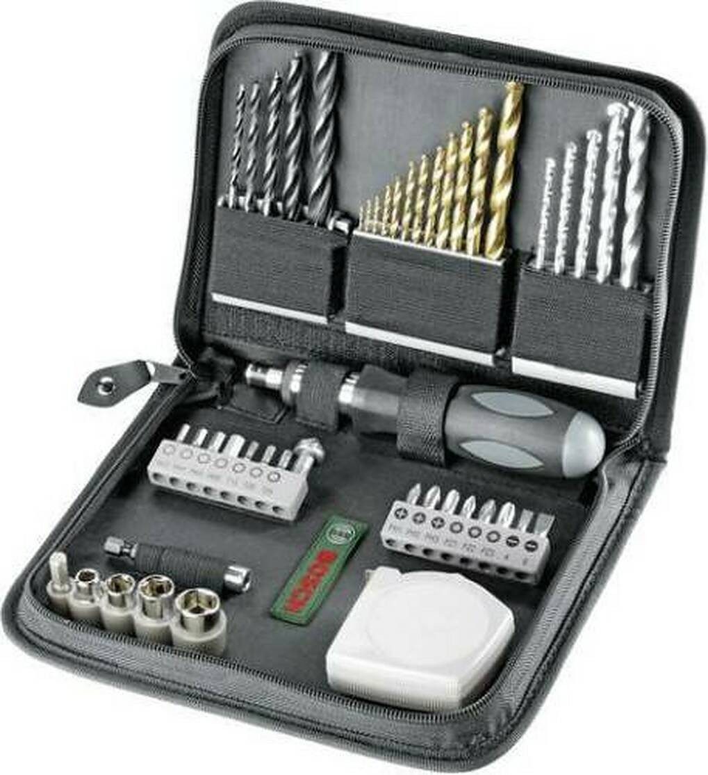 Set beinhaltet | Bohrer, Bits, Steckschlüsselnüsse, Hand-Bithalter, Bithalter, Kegelsenker, Maßband |