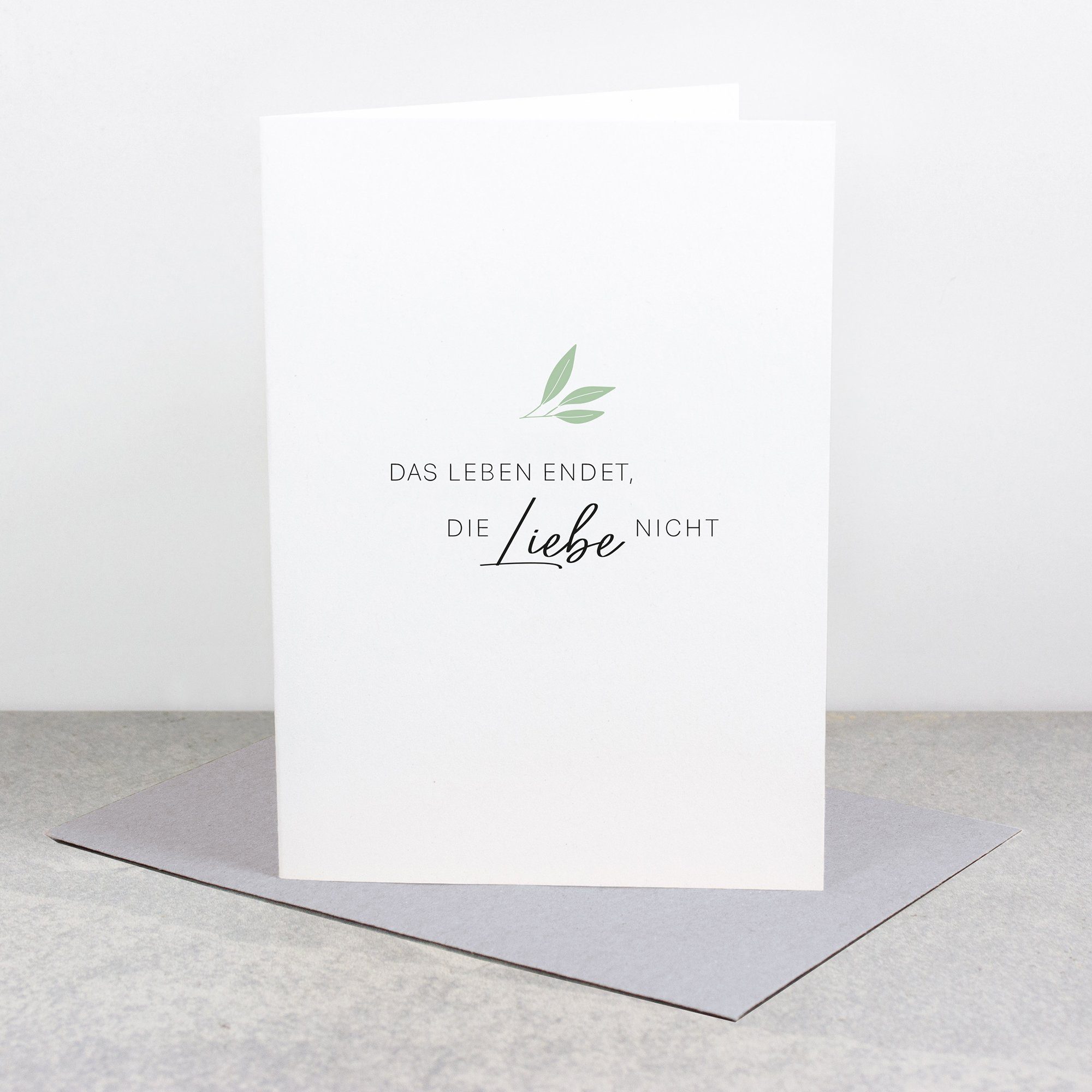 In einer Trauersituation die passenden Worte zu wählen ist nicht so einfach. Unsere Klappkarte hilft Ihnen dabei den richtigen Ansatz zu finden. Mit dem Spruch „Das Leben endet, die Liebe nicht“ vermitteln Sie den Angehörigen ein wenig Hoffnung und dass die Zuneigung zu dem geliebten Menschen immer bleiben wird. Die Karte besteht aus 100 % Recyclingpapier und wird in Deutschland klimaneutral mit veganen Farben auf Pflanzenölbasis bedruckt. Auch auf der Innenseite ist ein kleines dekoratives Element aufgedruckt. Die Farbe des Umschlags kann gewählt werden: Grauer Umschlag: Der selbstklebende graue Umschlag besteht aus Papier aus nachhaltiger Forstwirtschaft. Er ist zudem mit einer leichten Rippenstruktur geprägt, die dem Kuvert eine besondere Haptik verleiht. Umschlag in Recyclingbraun: Der selbstklebende Umschlag besteht aus reinem Recyclingpapier und hat eine natürlich braune Färbung. Maße: Karte DIN A6 / Umschlag DIN C6