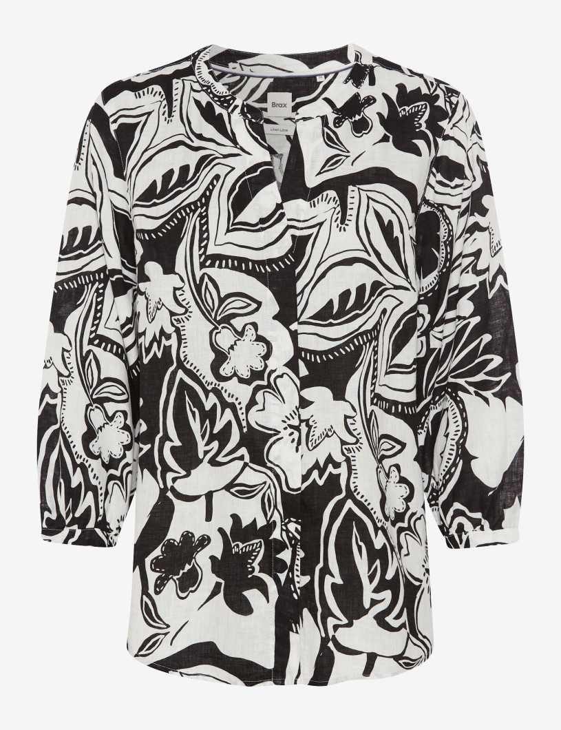 Ein Hauch von Leichtigkeit und moderner Eleganz ? die Damenbluse im Style VELIA vereint sommerliche Frische mit einem stilvollen Design. Die gerade Silhouette mit Tunika-Ausschnitt und 3/4-Ärmeln sorgt für eine entspannte Ausstrahlung, während die verdeckte Knopfleiste eine cleane Note einbringt. Der gerundete Saum und feine Raffungen im Rückenteil unterstreichen die fließende Optik und verleihen dem Look eine feminine Nuance. Der plakative Flowerprint in schlichter Zweifarbigkeit setzt einen modernen Akzent und macht die Bluse zu einem vielseitig kombinierbaren Highlight. Neben der ausdrucksstarken Optik punktet auch das Material. Reines Leinen überzeugt mit seiner atmungsaktiven Qualität, fühlt sich angenehm leicht auf der Haut an und sorgt für ein natürliches Tragegefühl ? ideal für warme Tage mit Stil.