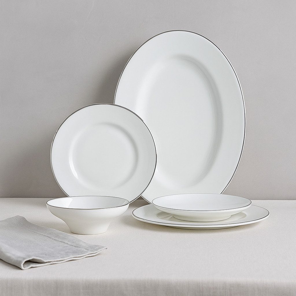 Der hauchdünne, silberfarbene Rand rundet das elegante Gesamtbild perfekt ab und macht das Set zu einem stilvollen Blickfang auf jedem Esstisch.