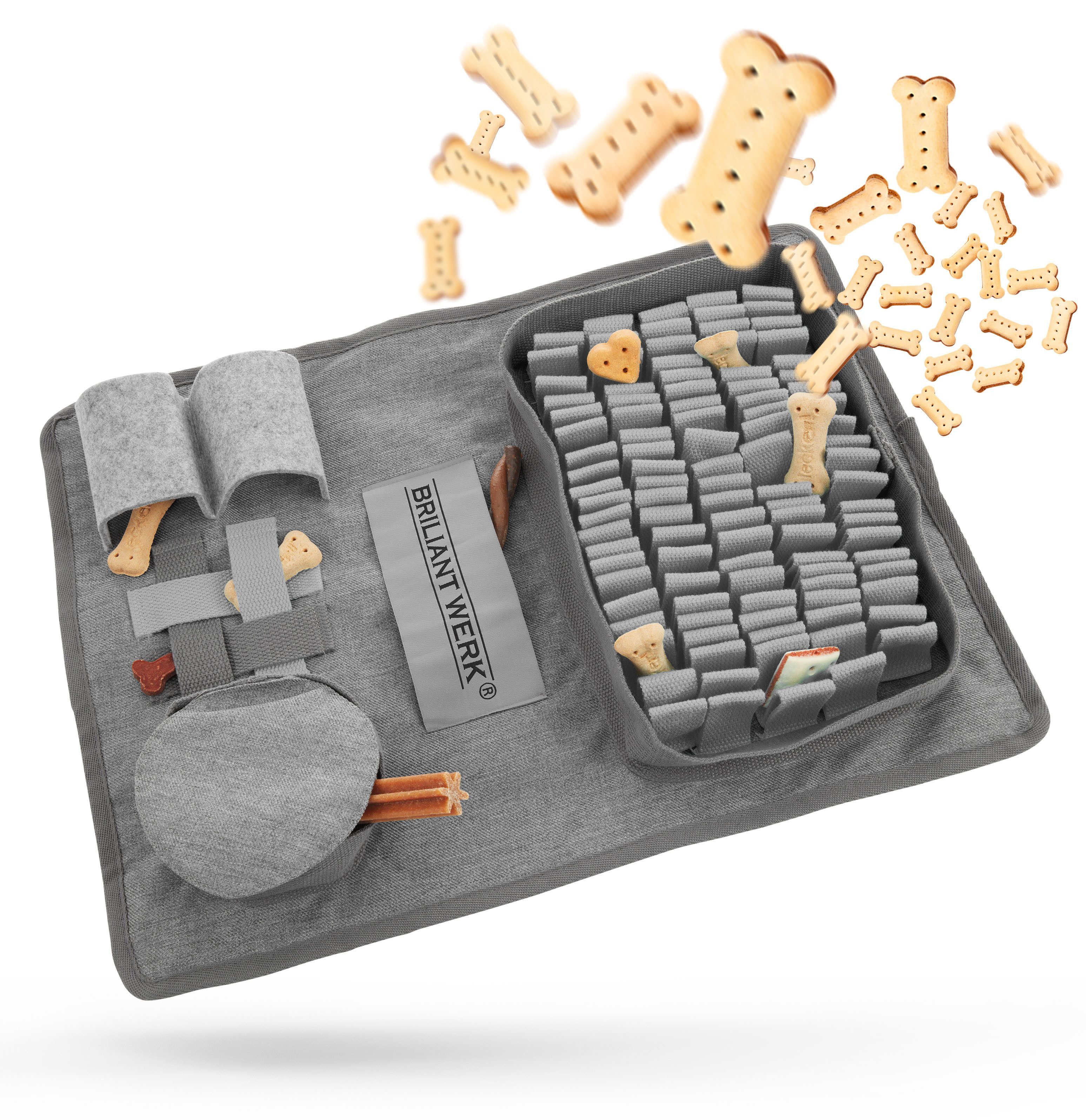 Schnüffelteppich für Hunde – Das ultimative Intelligenzspielzeug Unser Schnüffelteppich für Hunde ist das perfekte Intelligenzspielzeug für Ihren Vierbeiner. Entwickelt, um das natürliche Suchverhalten zu fördern, bietet dieser vielseitige Teppich eine spannende und lehrreiche Erfahrung für Hunde aller Größen. Ob als Schnüffelteppich Hund klein oder groß, unser Modell bietet die ideale Lösung für die geistige Stimulation und Beschäftigung Ihres Haustiers. Vielseitige Anwendung Der Schnüffelteppich Hund eignet sich hervorragend für ausgedehnte Suchspiele, die das Hirn Ihres Hundes herausfordern. Dieser Futterteppich für Hunde kann sowohl für kleine als auch große Hunde verwendet werden und ist in verschiedenen Größen erhältlich. Er fördert das Schnüffeln und die mentale Stimulation durch versteckte Leckerchen, die Ihr Hund finden muss. Ideal für den Einsatz als schnüffelteppich für große Hunde oder kleinere Rassen. Robustes Design Unser Schnüffelteppich ist nicht nur ein unterhaltsames Hundespielzeug, sondern auch besonders robust und bissfest. Der Schnüffelteppich Hund groß ist aus strapazierfähigem, Material gefertigt, das selbst den stärksten Kiefern standhält. So können Sie sicher sein, dass der Teppich auch bei intensiven Spielsitzungen hält. Intelligenzspielzeug für geistige Stimulation Als Intelligenzspielzeug fördert der Schnüffelteppich die kognitive Entwicklung Ihres Hundes. Das Suchen nach versteckten Leckerchen regt die geistige Aktivität an und hält Ihren Hund mental fit. Dieses Suchspielzeug ist ideal, um Ihren Hund zu beschäftigen und seine natürliche Neugier zu fördern. Praktische Eigenschaften Rutschfest: Der Teppich bleibt auf glatten Böden sicher an Ort und Stelle. Leicht zu reinigen: Der Schnüffelteppich kann problemlos gewaschen werden, um ihn hygienisch zu halten. Vielseitig einsetzbar: Neben dem Einsatz als Schnüffelteppich kann er auch als Leckerli Teppich für Hunde und Katzen verwendet werden. Warum unser Schnüffelteppich? Fördert geistige Stimulation: Als Intelligenzspielzeug hält er Ihren Hund geistig aktiv. Vielseitig und langlebig: Ideal für verschiedene Hunderassen und robust gegen intensives Kauen. Praktisch und pflegeleicht: Einfach zu reinigen und zu verwenden. Unser Schnüffelteppich für Hunde ist nicht nur ein großartiges Intelligenzspielzeug, sondern auch ein unverzichtbares Hilfsmittel zur Beschäftigung Ihres Vierbeiners. Er bietet stundenlangen Spaß und fördert gleichzeitig die mentale Gesundheit Ihres Hundes. Holen Sie sich diesen hochwertigen Schnüffelteppich und machen Sie das Spiel für Ihren Hund noch spannender!