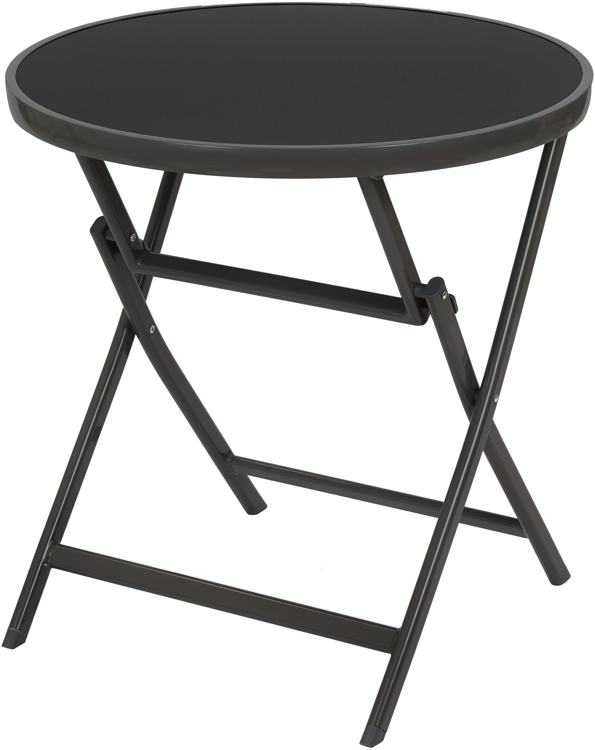 Das Gestell besteht aus stabilem Metall, was den Tisch besonders witterungsbeständig macht. Die Glasplatte besteht aus getöntem Sicherheitsglas (ESG). Mit dem großen Durchmesser von 70 cm ermöglicht die runde Glasplatte das Abstellen zum Beispiel von heißen und kalten Snacks und Getränken.