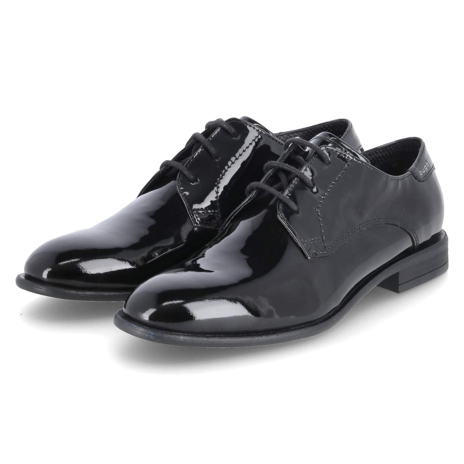 Die BUGATTI Herren Schnürschuhe bestechen durch edles schwarzes Lackleder und ein klassisches Design, das ideal für Businessanlässe oder festliche Gelegenheiten ist. Als stilvolle Businessschuhe überzeugen sie mit einer verstärkten Ferse, die einen kleinen, dezenten Markenschriftzug trägt. Die Ziernähte verleihen den Halbschuhen eine elegante Optik. Für optimalen Tragekomfort sorgen die flexible, rutschhemmende Laufsohle mit leichtem Profil und die hochwertige Verarbeitung, die jeden Schritt angenehm macht. Bitte beachten Sie, dass dieses Modell etwas schmaler ausfällt.