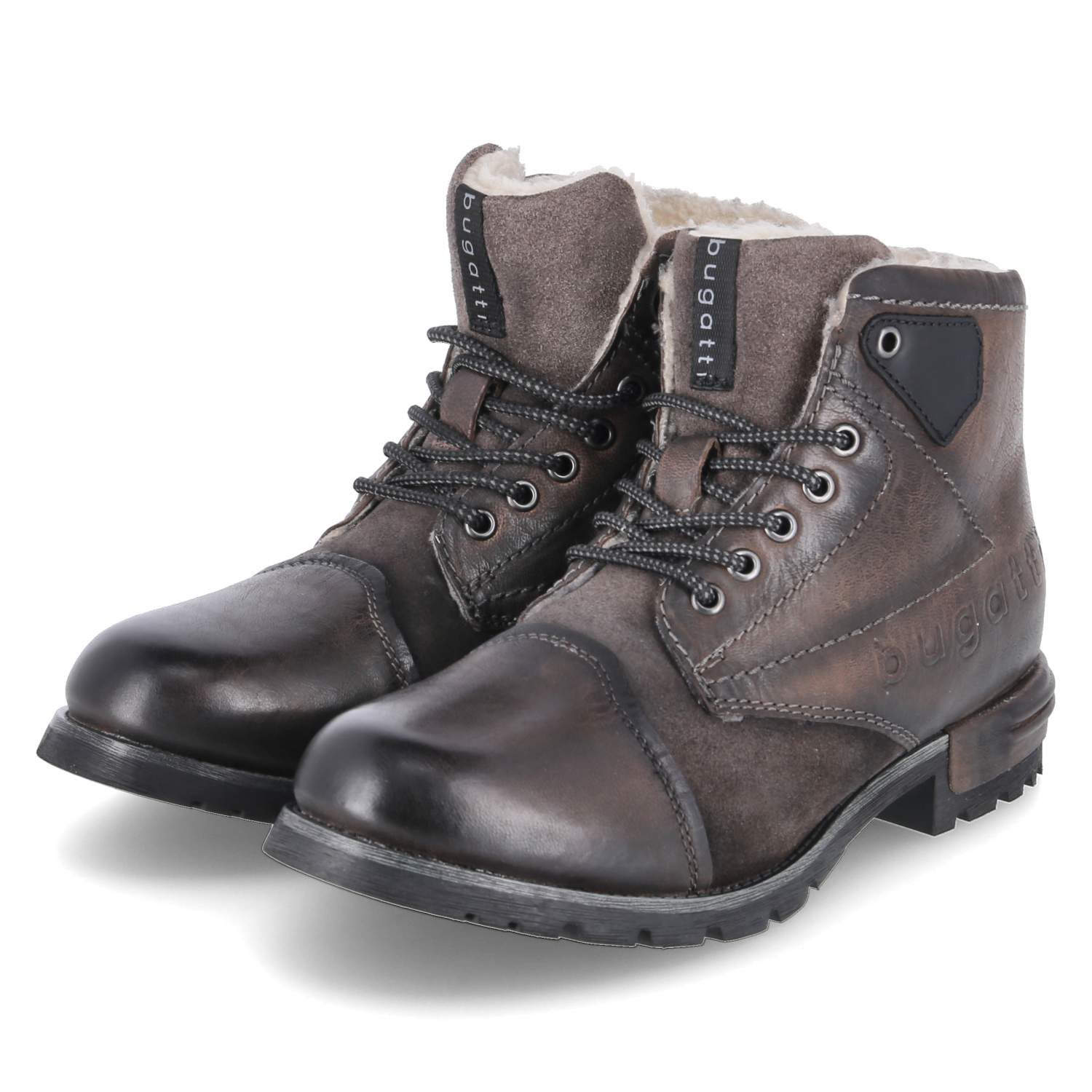 Die Bugatti Herren Winterboots in dunkelbraunem Glattleder mit Used Look kombinieren stilvolles Design und Funktionalität. Die Kombination aus Schnürung und seitlichem Reißverschluss sorgt für einfaches An- und Ausziehen sowie eine individuelle Passform. Der verstärkte Zehen- und Fersenbereich bietet zusätzlichen Schutz und Langlebigkeit. Der leicht gepolsterte Einstieg und das warme Teddyfutter garantieren angenehmen Tragekomfort, auch bei kalten Temperaturen. Das flexible, rutschfeste Profil der Laufsohle sorgt für sicheren Halt auf verschiedenen Untergründen. Das Wechselfußbett bietet zusätzlichen Komfort und kann bei Bedarf ausgetauscht werden, was diese Stiefeletten ideal für den Winter macht.