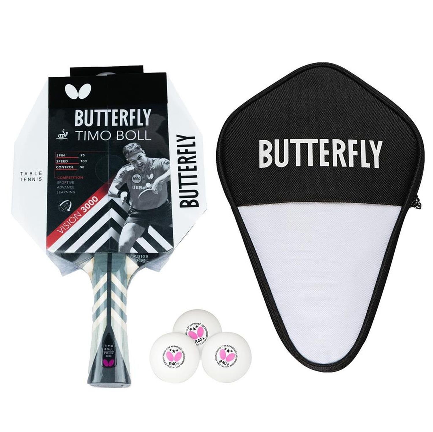 Butterfly 1x Timo Boll Vision 3000 Tischtennisschläger + Tischtennishülle + 3x 40+ 3*** Tischtennisbälle Ausgefeilter Profi Tischtennisschläger BUTTERFLY TIMO BOLL Vision 3000 für technisch fortgeschrittene Spieler. Wakaba Belag mit 2,2mm Schwamm, ermöglicht hohe Geschwindigkeit beim Offensivspiel. Konkaver Griff. Der Tischtennisschläger besitzt außerdem ein 9mm Butterfly Kantenband, der Schläger ist mit einer aufwendigen Gestaltung verschiedener Holzschichten ausgestattet und eine Linse ist im Griff verbaut. Das besondere am Griff ist zudem noch die Technologie des EGS (Edge Guard System). Eine innovative Schlägertechnologie, die den Energieverlust verhindert. Die durch den Aufprall des Balls entstehende Energie bleibt aufgrund des Kantenfurniers im Inneren des Schlägers. Die Energie wird erst durch den Rückschlag wieder freigesetzt und ermöglicht somit kraftvolle Schläge. Der Vision 3000 Schläger überzeugt mit seinen Werten ausgehend von 100: Speed 100 / Spin 95 / Control 90. Der Schläger wird in einer Halbblisterverpackung geliefert, der zum Schutz des Schlägers dient. Hochwertige Schlägerhülle Hochwertige Schlägerhülle BUTTERFLY CELL CASE I für 1 Schläger und 4 Bälle, Nylon 600 D in neuartiger und außergewöhnlicher Form, inkl. praktischer Schlaufe zum Aufhängen. TT-Bälle BUTTERFLY 3 STERN R40+, weiß, 3 Stk., Plastikball 40+. Die identische Dicke des Materials garantiert eine nahe perfekte Ball Performance auf Weltklasseniveau. Verschiedene Tests bestätigen konstante Leistungsfähigkeit hinsichtlich Rotation, Absprung und Flugverhalten. Die enorme Stabilität setzt neue Maßstäbe. In Kartonverpackung.