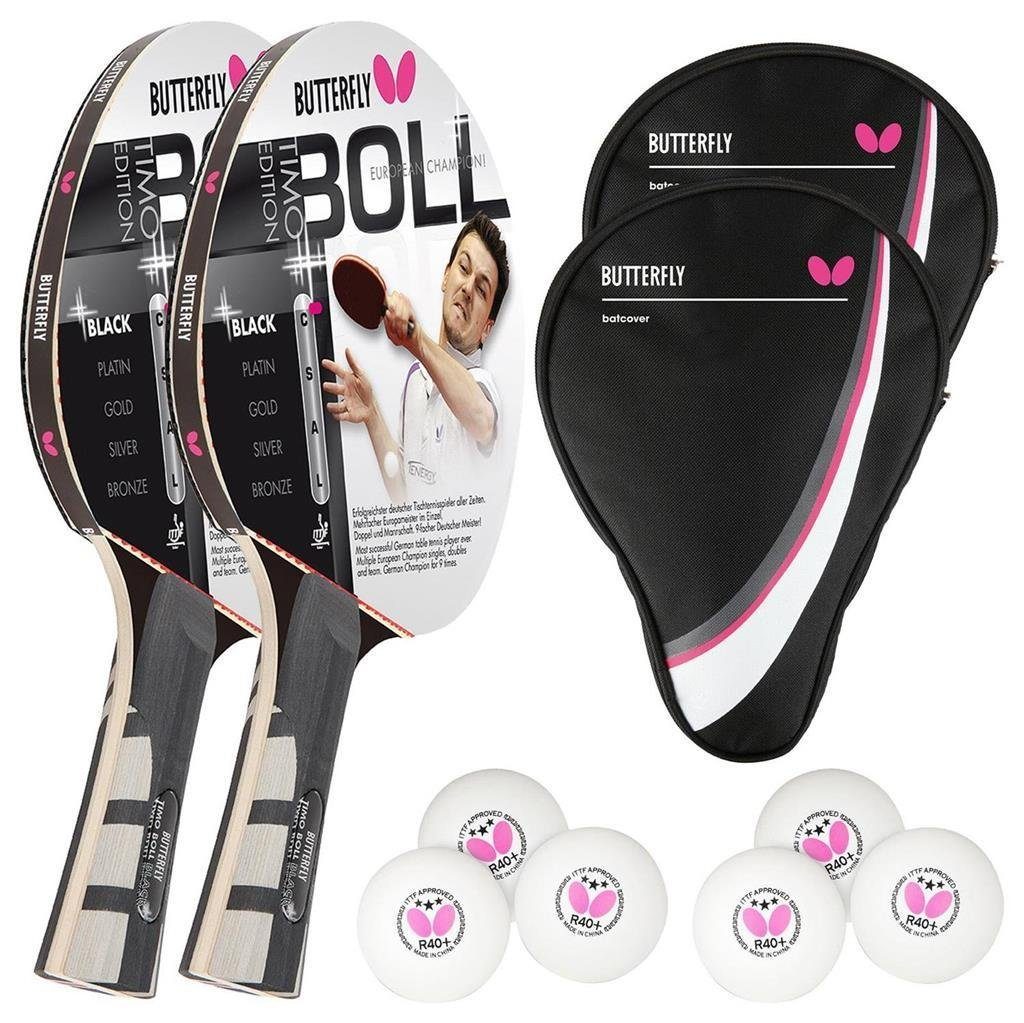 Lieferumfang | Butterfly 2x Timo Boll Black 85030 Tischtennisschläger + 2x Hülle + 6x Bälle |