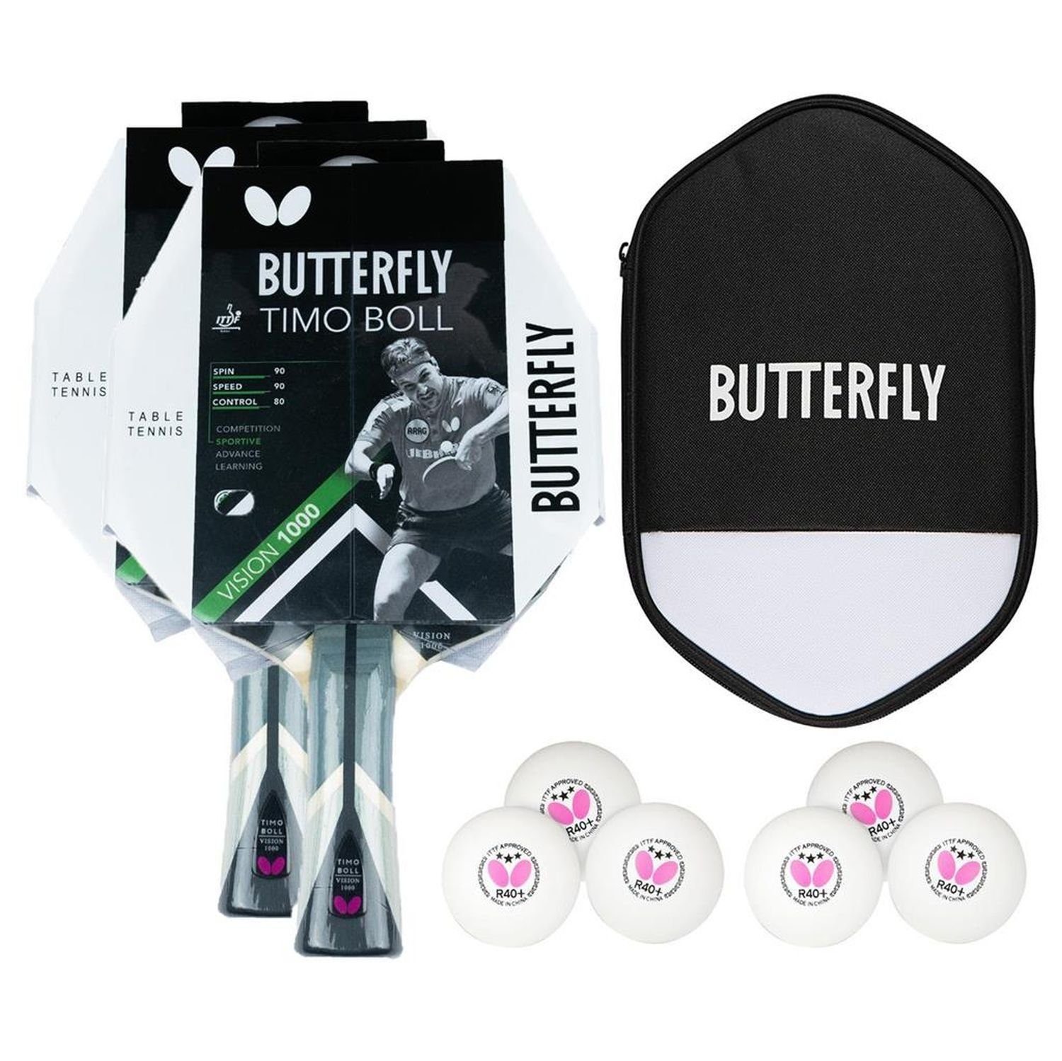 Butterfly 2x Timo Boll Vision 1000 Tischtennisschläger + Tischtennishülle + 6x 40+ 3*** Tischtennisbälle Ausgefeilter Profi Tischtennisschläger BUTTERFLY TIMO BOLL Vision 1000 für technisch fortgeschrittene Spieler. Pan Asia Belag mit 1,8mm Schwamm, ermöglicht hohe Geschwindigkeit beim Offensivspiel. Konkaver Griff. Der Tischtennisschläger besitzt außerdem ein 9mm Butterfly Kantenband, der Schläger ist mit einer aufwendigen Gestaltung verschiedener Holzschichten ausgestattet und eine Linse ist im Griff verbaut. Das besondere am Griff ist zudem noch die Technologie des Parabolic Grip. Eine aufwendige Bearbeitung der Griffschalen rundet die Enden des Griffes exakt ab. Der Schläger liegt besser in der Hand und bietet auch bei einem festeren Griff des Spielers mehr Kontrolle und Spielgefühl. Der Schläger wird in einer Halbblisterverpackung geliefert, der zum Schutz des Schlägers dient. Hochwertige Schlägerhülle Hochwertige Schlägerhülle BUTTERFLY CELL CASE II für 2 Schläger und 6 Bälle, Nylon 600 D in neuartiger und außergewöhnlicher Form, inkl. praktischer Schlaufe zum Aufhängen. TT-Bälle BUTTERFLY 3 STERN R40+, weiß, 3 Stk., Plastikball 40+. Die identische Dicke des Materials garantiert eine nahe perfekte Ball Performance auf Weltklasseniveau. Verschiedene Tests bestätigen konstante Leistungsfähigkeit hinsichtlich Rotation, Absprung und Flugverhalten. Die enorme Stabilität setzt neue Maßstäbe. In Kartonverpackung.