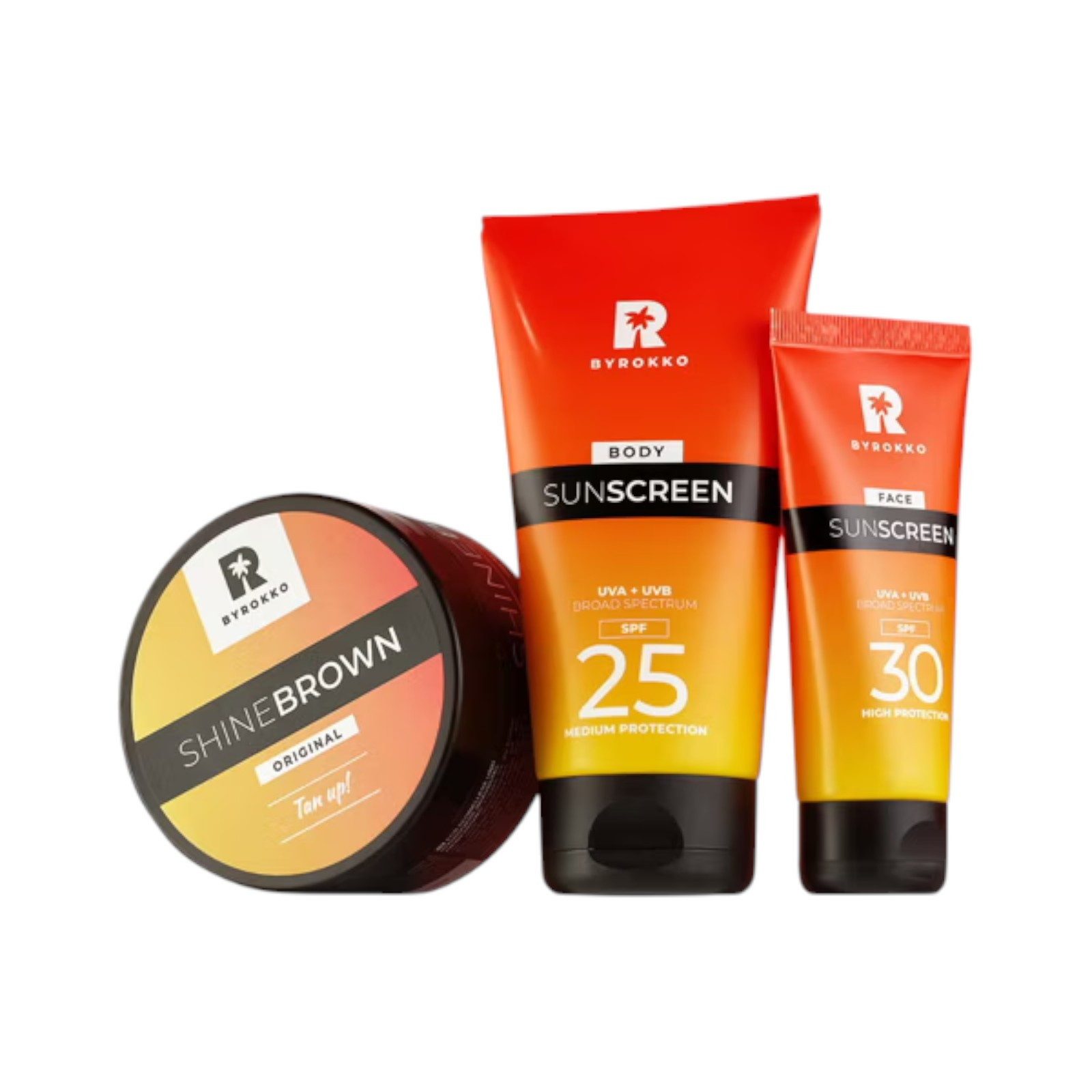 Body Sunscreen SF 25 (150 ml) + Face Sunscreen LSF 30 (50 ml) + Premium Tan Boosting Cream (210 ml) Drei Produkte, die du brauchst, um deine Haut effektiv vor UVA/UVB-Strahlen zu schützen, ihr die nötige Feuchtigkeit zu spenden und die schönste Bräune deines Lebens zu bekommen! FACE SUNSCREEN SPF 30: Die schwerelose Formel mit hohem UVA-/UVB-Schutz enthält feuchtigkeitsspendende und pflegende Inhaltsstoffe, die deine Gesichtshaut effektiv vor der Sonne schützen und dir ein reines, natürliches Gefühl verleihen. BODY SUNSCREEN SPF 25: Schnell einziehender & herrlich duftender Sonnenschutz mit mittlerem (LSF 25) Schutz vor schädlichen UVA/UVB-Strahlung, der auch als Feuchtigkeitscreme für Ihre Haut dient. SHINE BROWN CREAM: Unsere Original-Bräunungscreme mit einer bewährten Formel, die den Bräunungsprozess ankurbelt. Das bedeutet, dass du kürzer in der Sonne bleiben kannst und trotzdem stärker gebräunt wirst als je zuvor.