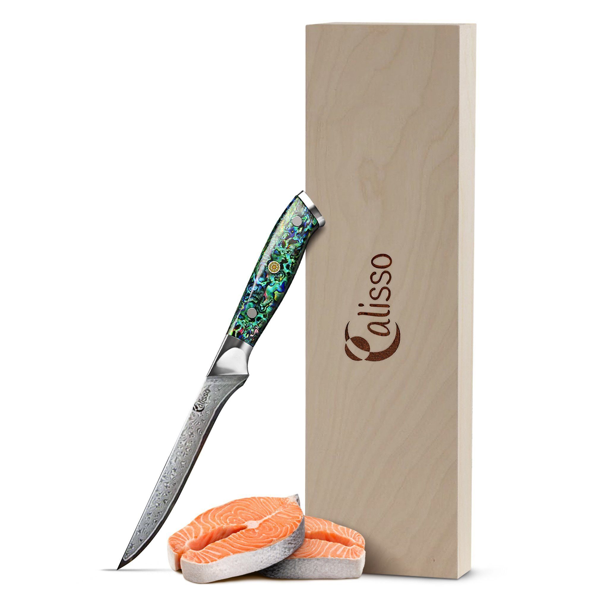 Hauptsächlich wird das Filetiermesser für das Filetieren von Fisch verwendet. Es kann jedoch auch für die Zubereitung von Fleisch genutzt werden, da sich durch die scharfe und dünne Klinge Sehnen und Haut sehr leicht entfernen und das Fleisch in dünne Scheiben schneiden lässt. Da die Klinge sehr scharf ist empfehlen wir die Benutzung eines Filetierhandschuhs. Produktdetails Unsere Damastmesser bestehen aus verschieden harten Lagen Stahl und Eisen, welche zu 67 Schichten zusammengeschmiedet wurden. Dadurch sind unsere Damastmesser äußerst flexibel, stabil und können besonders scharf geschliffen werden und bleiben lange scharf. Material Klinge: 67 Lagen Damaskus Stahl, bestehend aus 66 Lagen 10Cr15CoMoV und 1 VG-10 Damaskus Stahlkern Material Griff: Kohlefaser und Goldfolie, eingeschlossen in Acryl Härtegrad: 60 ± 2 HRC Unglaubliche Schärfe durch Schleifwinkel von 15° Der verwendete Stahl und eine gründliche Politur jeder Klinge führen zu guter Rostbeständigkeit. Der Griff ist in einzigartiger Muscheloptik angefertigt und für ausgezeichnete Kontrolle, Agilität und Komfort beim Schneiden entwickelt. Damit liegt das Messer auch über längere Arbeitsphasen in der Küche gut in der Hand. Achtung: Das Messer ist nicht zum Zerhacken von Knochen geeignet! Pflegehinweise Ein gutes Küchenmesser aus Damaskus-Stahl sollte gut gepflegt werden. Lesen Sie sich dafür gerne unsere Hinweise online unter https://calisso.de/pages/pflegehinweise durch.
