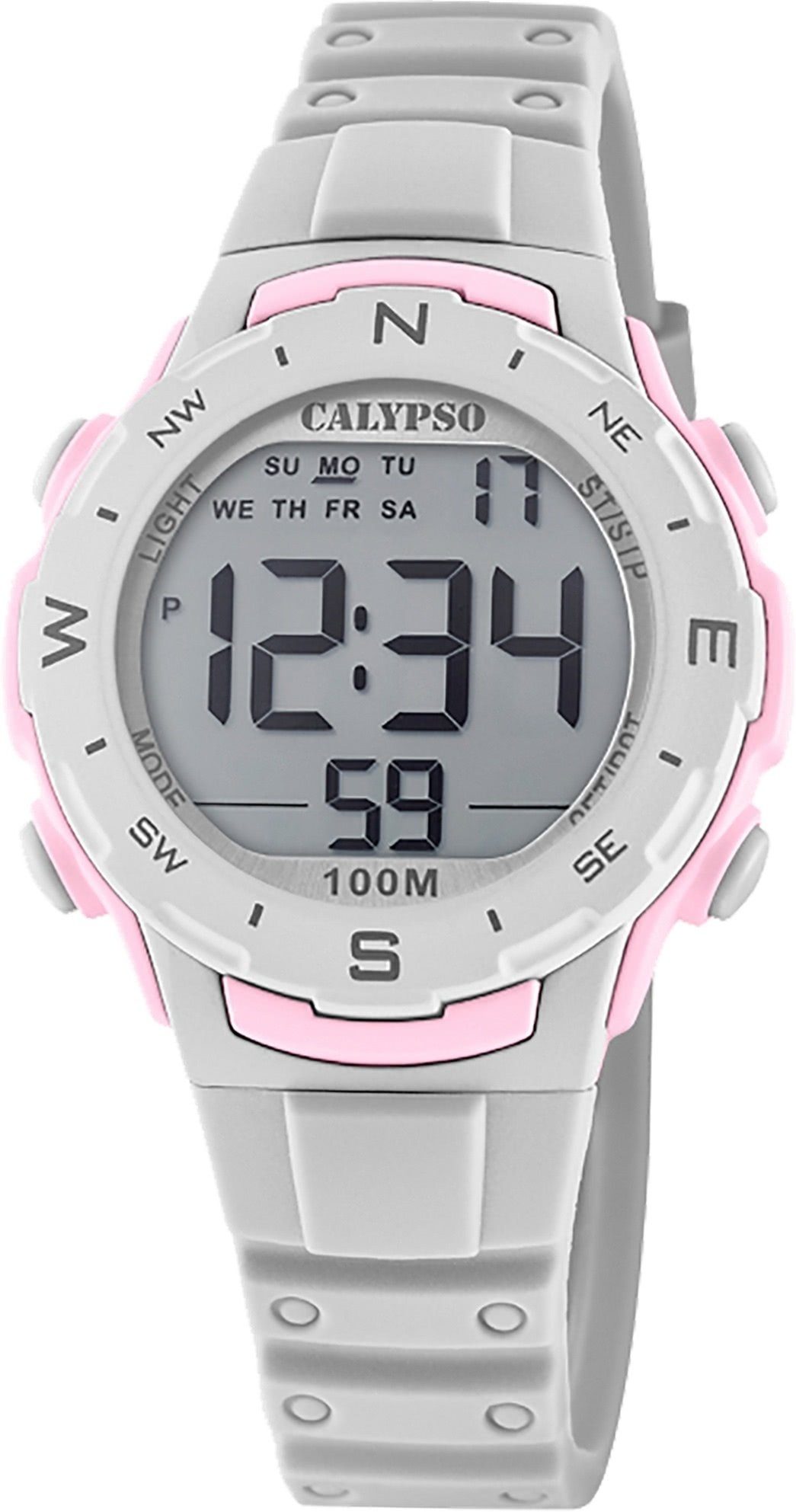Die Sport Uhr der Marke Calypso hat ein schönes Armband aus Kunststoff in grau mit Dornschließe. Eine Uhr aus der Calypso Digital Kollektion für Damen in der Gehäusefarbe grau rosa mit Quarzwerk. Die Digitaluhr mit Kunststoffglas hat ein Zifferblatt in der Farbe grau. Die Form der Uhr ist rund und das Gehäuse ist mittelgroß ca. 35mm.