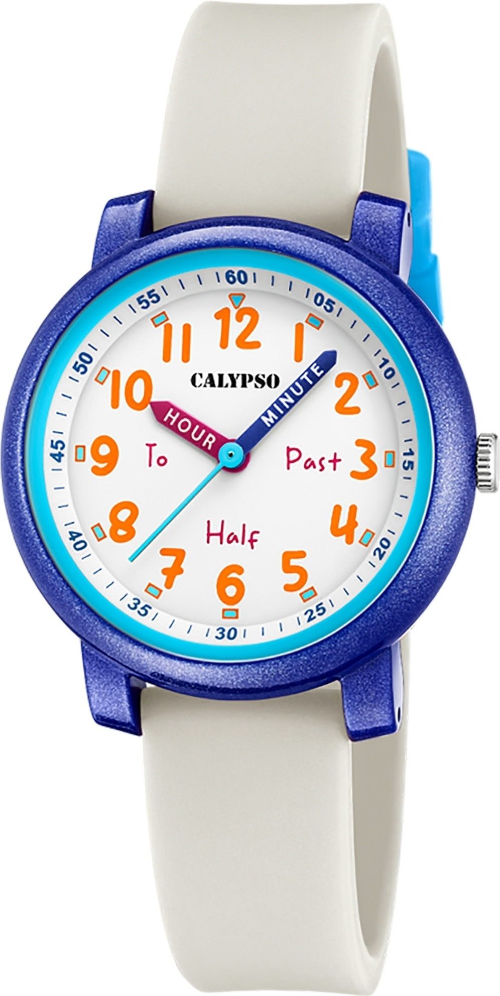 Die Fashion Uhr der Marke Calypso hat ein schönes Armband aus Kunststoff Silikon in weiß mit Dornschließe. Eine Uhr aus der Calypso Junior Kollektion für Kinder in der Gehäusefarbe blau mit Quarzwerk. Die Analoguhr mit Kunststoffglas hat ein Zifferblatt in der Farbe mehrfarbig weiß. Die Form der Uhr ist rund und das Gehäuse ist mittel ca. 32mm.
