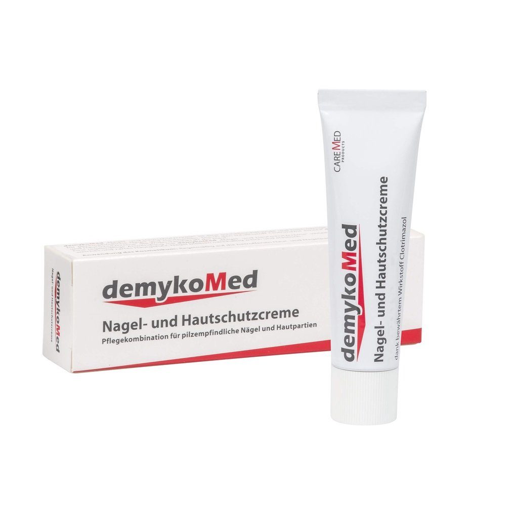 demykoMed Nagel- und Hautschutzcreme ist eine schnell einziehende und hochwertige Pflegekombination für pilzempfindliche Nägel und Hautpartien. Ausgesuchte Inhaltsstoffe pflegen Ihre Nägel und Hautpartien um die Nägel. Durch den Inhaltsstoff Clotrimazol erhöht sich die Widerstandskraft der Haut. Die regelmäßige Anwendung von demykoMed Nagel- und Hautschutzcreme unterstützt die Hautzellen bei ihrer Regeneration und gibt ein angenehm weiches und zartes Hautgefühl. Nägel bleiben weich und elastisch. - Schnelleinziehende Creme - angenehmer Geruch - Farblos, - feuchtigkeitsspendend Wichtige Inhaltsstoffe: Clotrimazol, Urea, Bisabolol, Panthenol (Provitamin B5), Allantoin Anwendung: Täglich 1-2 mal dünn auftragen, gut in Haut und Nägel einmassieren.