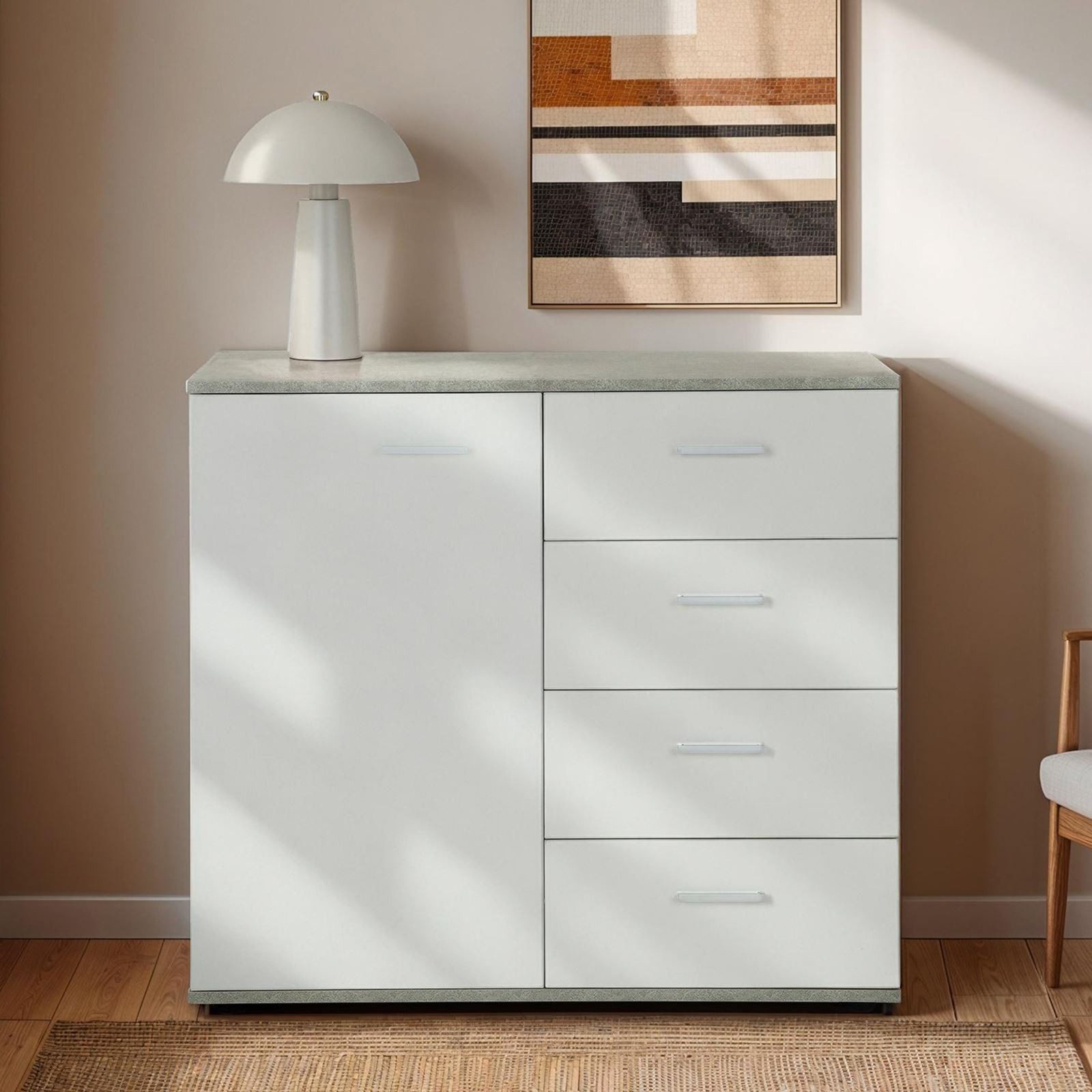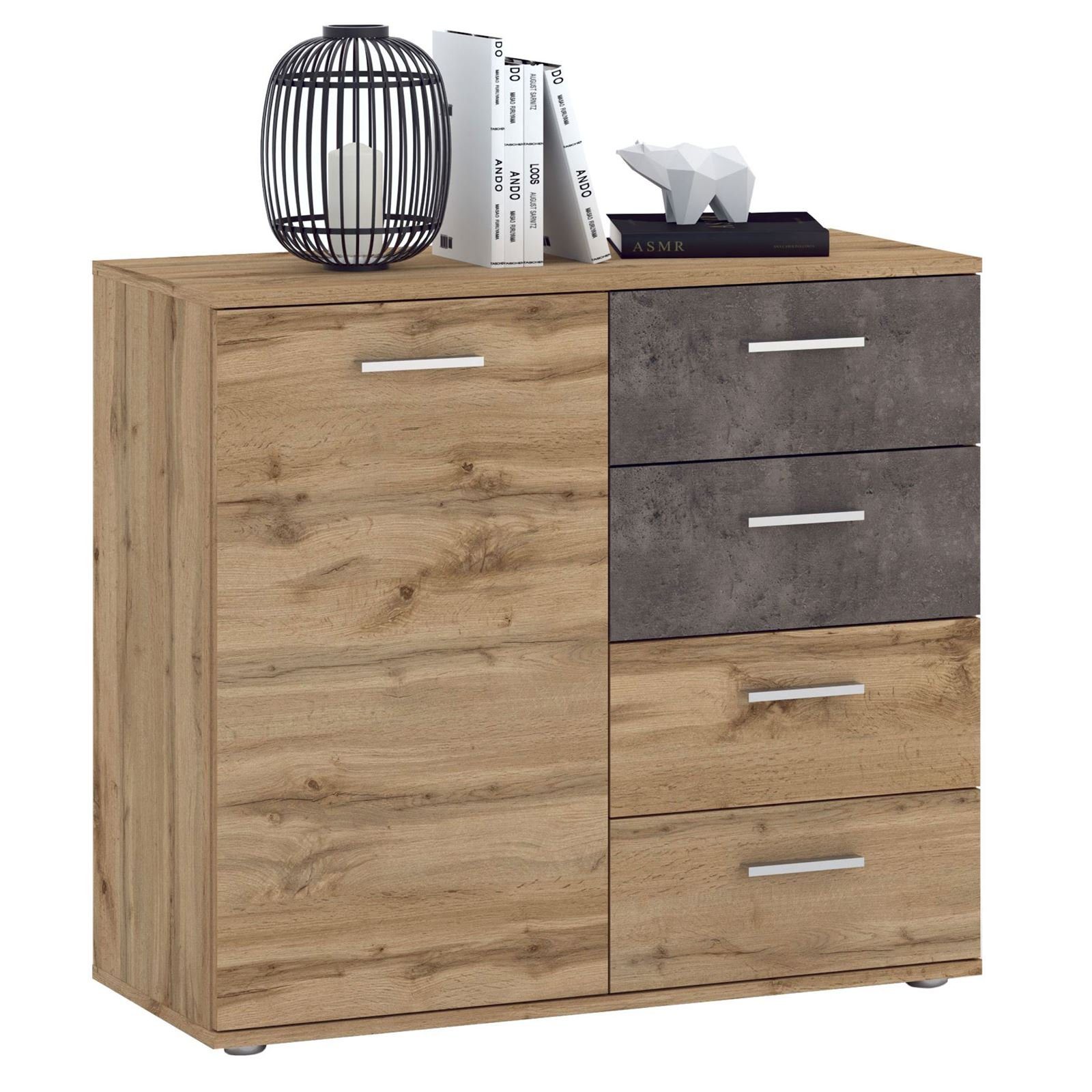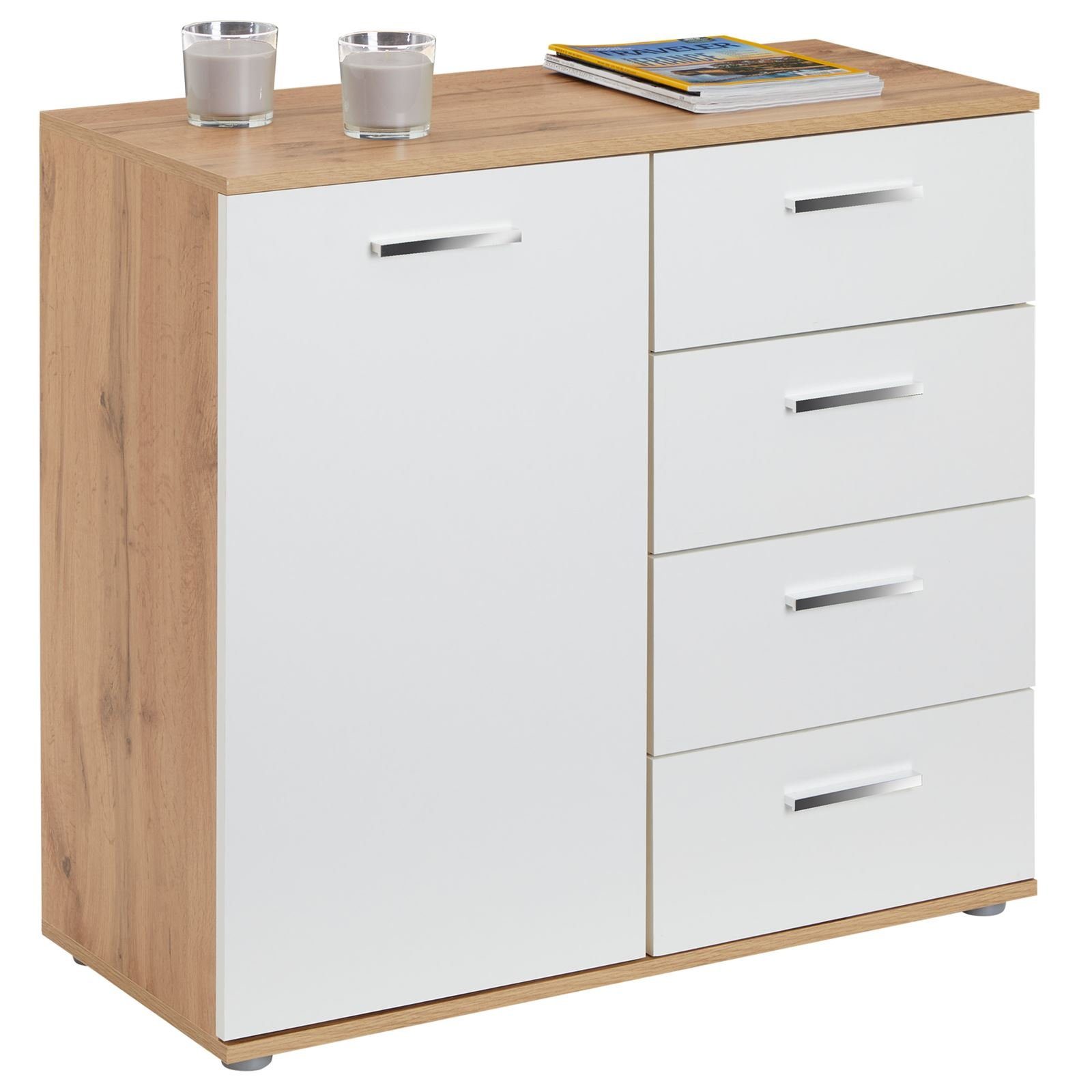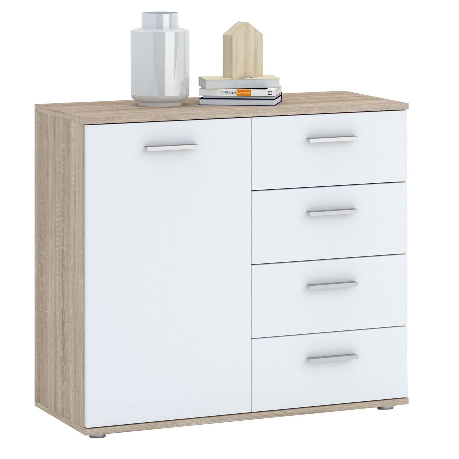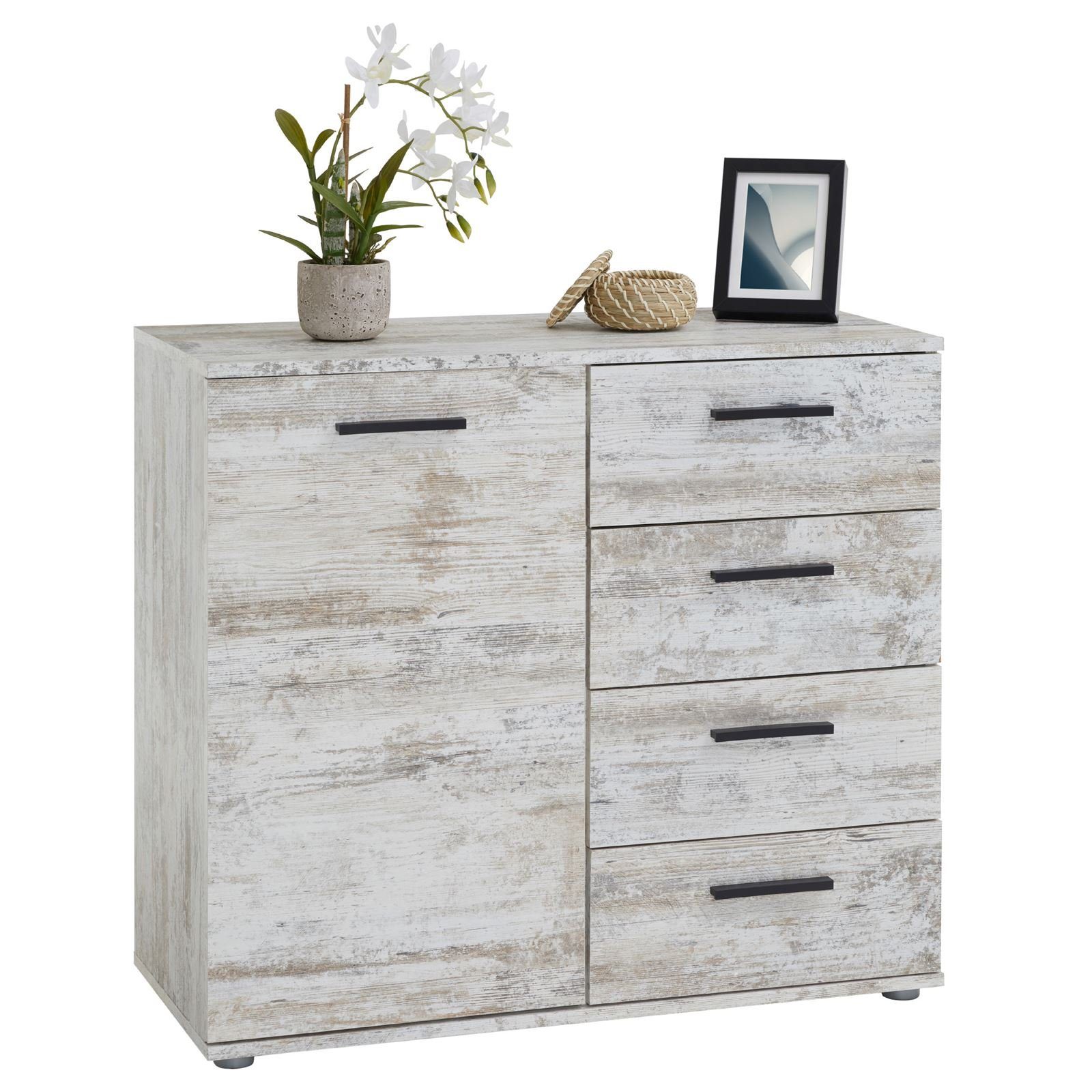 bietet hinter der Tür und in den vier Schubladen jede Menge Platz für das Verstauen von Gegenständen, Haushaltsutensilien und vieles mehr. Dank der Einlegeböden können Sie den Schrank perfekt ausnutzen. Zur Unterbringung von Kleinigkeiten sind die Schubladen bestens geeignet. Durch die herausnehmbaren Einlegeböden besteht die Möglichkeit auch größere Dinge unterzubringen. Die Kommode überzeugt mit dem aktuellen Design und bringt frischen Wind in Ihre vier Wände.