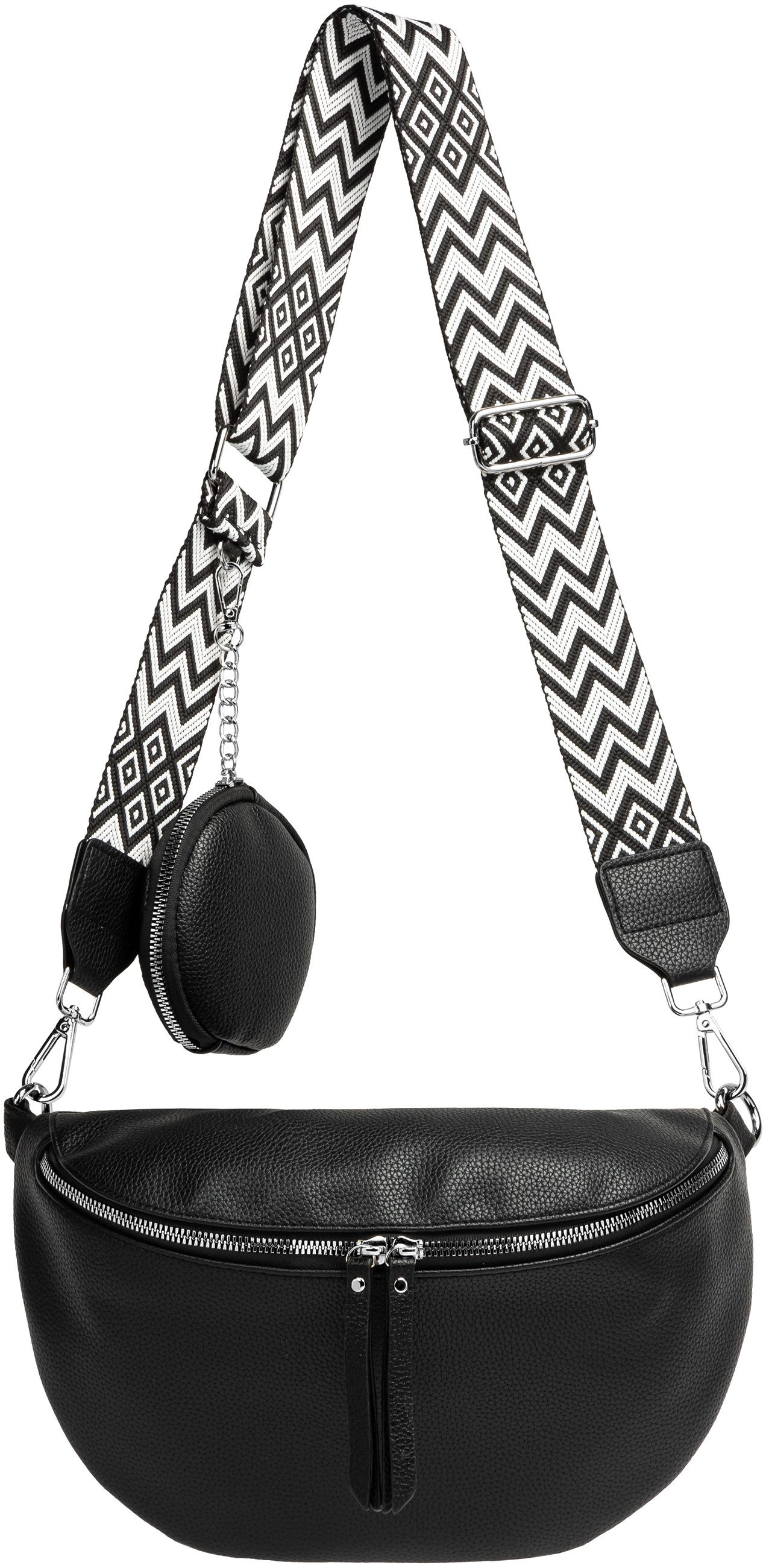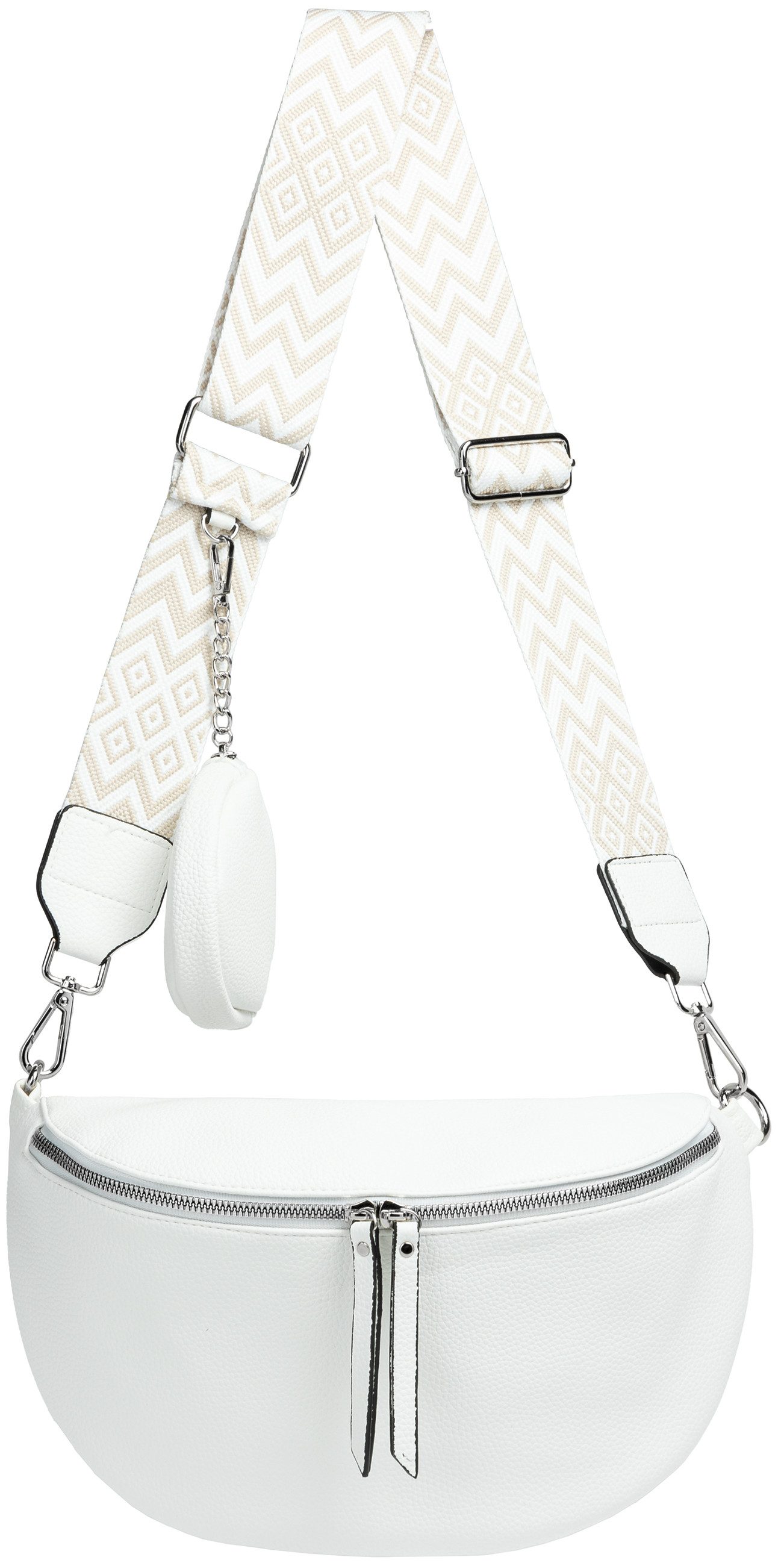 Dank des verstellbaren und breiten Textiltragegurts (maximale Довжина: 140 cm / Breite 48mm) mit silberfarbener Metallschnalle kannst Du die Tasche flexibel tragen: klassisch um die Hüfte, lässig über der Schulter oder als Crossbody Bag.