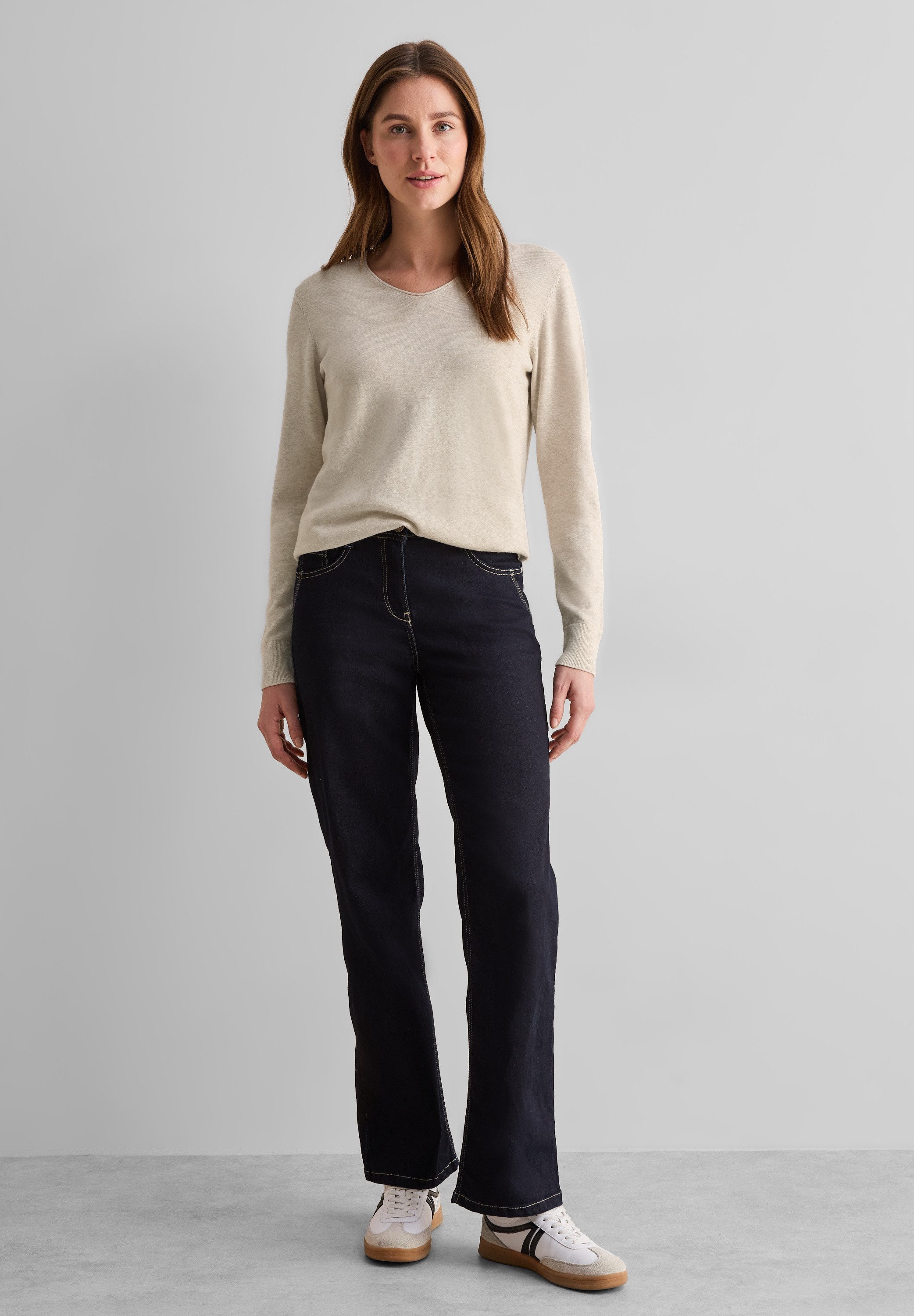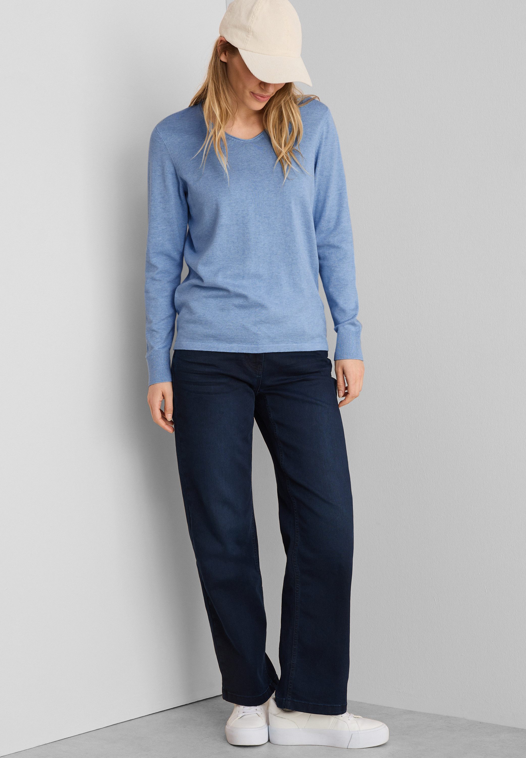 Schau dir den Strickpullover von Cecil mal genauer an. Die langen Ärmel enden in einem Rippbündchen, das für guten Sitz sorgt. Dieser Pullover hat einen V-Ausschnitt und ist taillenbedeckend sowie basic geschnitten, sodass dein Oberkörper dezent in Szene gesetzt wird.