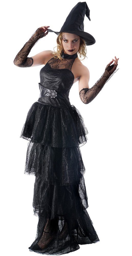 Wer sagt, dass Hexen immer hässliche, bucklige Frauen mit einer großen, verwarzten Hexennase und mit einem faltigen Gesicht sind? Es gibt auch hübsche Hexen, die durchaus Wert auf ein sexy Outfit legen. Mit diesem tollen Spider Hexenkostüm Deluxe Cornelia gelingt Ihnen der große Auftritt zu Halloween, Gothic Festival, Mottoparty und Fasching und Ihre Freunde und Bekannte werden verzaubert sein. Das Kostüm besteht aus einem langen ärmellosen Neckholder Kostümkleid, bei dem Ihr Dekollete mit einer schwarzen Spitze im Spinnennetz Muster bedeckt ist. Die Taille wird von einem angedeuteten Gürtel mit einem silbernen Spinnennetz betont. Sowohl der angesetzte lange, schwarze Voilant Rock, wie auch die Handstulpen bestehen aus schwarzer Spitze mit Spinnennetzmuster, wie im Dekolletebereich. Der Spitzhut mit der lässig abknickenden Hutspitze rundet das Kostüm perfekt ab und macht Sie zum Hingucker.