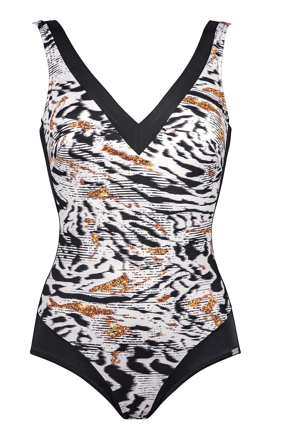 Charmline Safari Mood Badeanzug in 3 verschiedenen Ausführungen - Варіанти 1: - Badeanzug mit Softschalen und elastischem Unterbrustband / - tiefer V-Ausschnitt / - breite Träger, nicht längenverstellbar / - U-förmiger Rückenausschnitt / - Shape-Funktion Medium / - frauliche Schnittform mit Raffungen im Cup- und Unterbrustbereich / - klassisch Schwarz mit einer feinen Dosis Eleganz in Weiss und Gold / - Material: 62% Polyamid, 38% Elasthan, Futter 90% Polyamid, 10% Elasthan / - Handwäsche, mildes Feinwaschmittel ohne Weichspüler, bitte im Schatten trocknen. ////////// Варіанти 2: //////////////////////////////////////////////////////////////////////////////////////////////////////////// - Badeanzug mit Softschalen und elastischem Unterbrustband / - vorn komplett unterfüttert / - V-Ausschnitt mit Blende vorn, Rückenausschnitt tiefer V-Ausschnitt mit Blende / - breite Träger, nicht längenverstellbar / - moderater Beinausschnitt mit goldenem Logo links / - Shape-Funktion Medium / - klassisch Schwarz mit einer feinen Dosis Eleganz in Weiss und Gold / - Material: 83% Polyamid, 17% Elasthan, Futter 90% Polyamid, 10% Elasthan / - Handwäsche, mildes Feinwaschmittel ohne Weichspüler, bitte im Schatten trocknen / Варіанти 3: ///////////////////////////////////////////////////////////////////////////////////////////////////////////////////// Artikeldetails: / - eleganter Badeanzug mit Shape-Funktion Medium / - eingearbeitetes Vorderfutter mit elastischem Unterbrustband, keine Softschalen / - herzförmiger Ausschnitt / - breite Träger, nicht längenverstellbar / - Rückenausschnitt tiefes U / - raffiniert eingearbeitetes grafisches Muster vorn / - klassisch Schwarz mit einer feinen Dosis Eleganz in Weiss und Gold / - Material: 40% Polyamid, 60% Elasthan, Futter 72% Polyamid, 28% Elasthan / - Handwäsche, mildes Feinwaschmittel ohne Weichspüler, bitte im Schatten trocknen / Charmline - modeliert Ihre Figur und lässt Sie bis zu einer Konfektionsgröße schlanker aussehen.