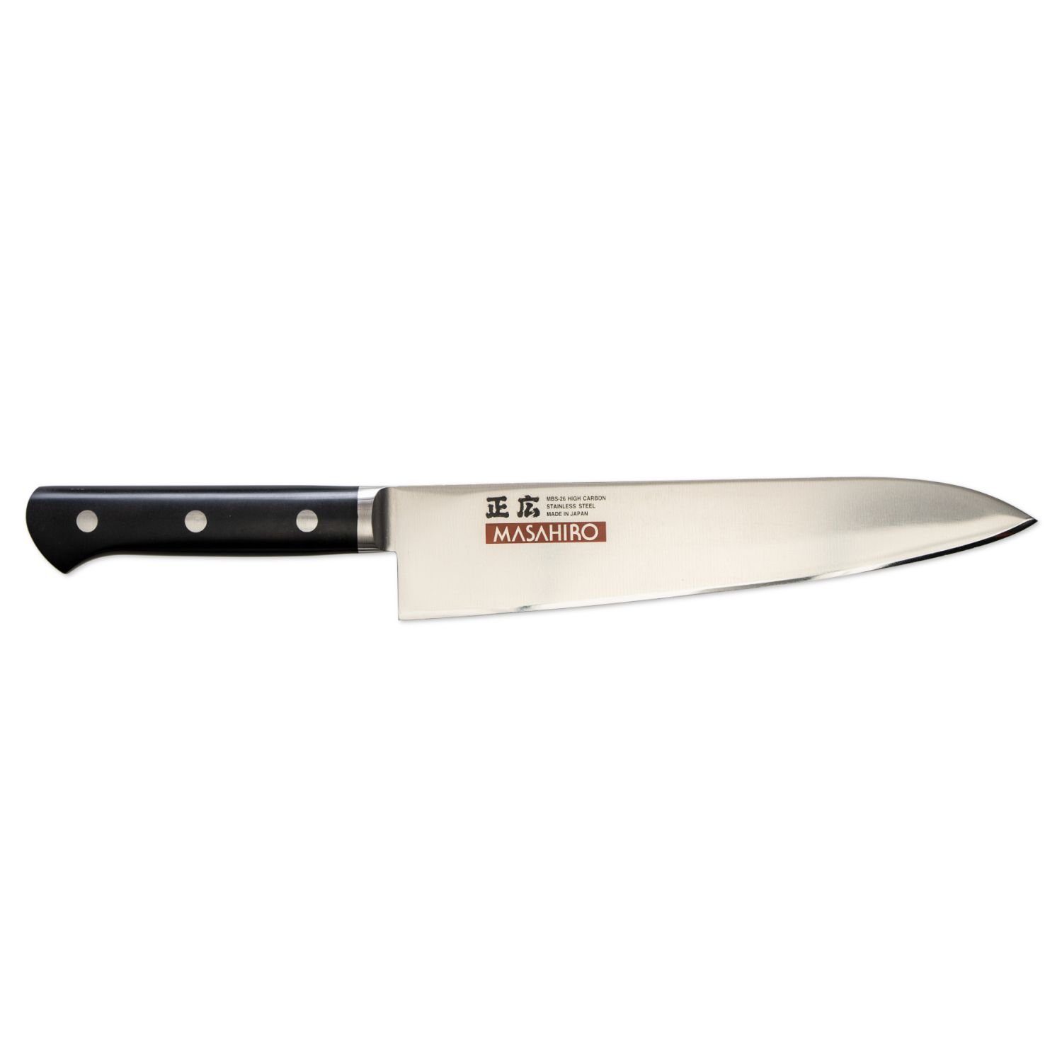 Die Serie Masahiro von Chroma stammt aus einer japanischen Messerschmiede in Seki, die sich auf sehr scharfe Kochmesser für Profi - und ambitionierte Hobbyköche spezialisiert hat. Die Klingen habe eine Härte von 58-60 HRC, so wird bei sehr guter Schärfe eine lange Standzeit der Schneide garantiert. Der Griff besteht aus antibakteriellem, wasser- und hitzebeständigem Kunststoff und ist für Rechts- und Linkshänder geeignet. Das Kochmesser ist das wichtigste Messer in der Küche: es kann universell zum Schneiden von Fisch, Fleisch und Gemüse verwendet werden. Das Messer hat eine Klingenlänge von 24 cm.