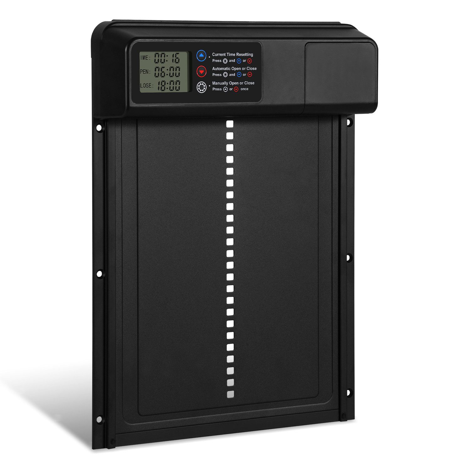 Timer-Steuerung: Mit einem eingebauten, präzisen Timer können Sie die Öffnungs- und Schließzeiten der Tür nach Ihren Bedürfnissen einstellen. Egal ob früh am Morgen oder spät in der Nacht, die Tür wird sich automatisch zur richtigen Zeit öffnen und schließen, sodass Ihre Hühner den Stall zu optimalen Zeiten betreten und verlassen. Dies spart Ihnen Zeit und sorgt dafür, dass Ihre Hände frei bleiben.