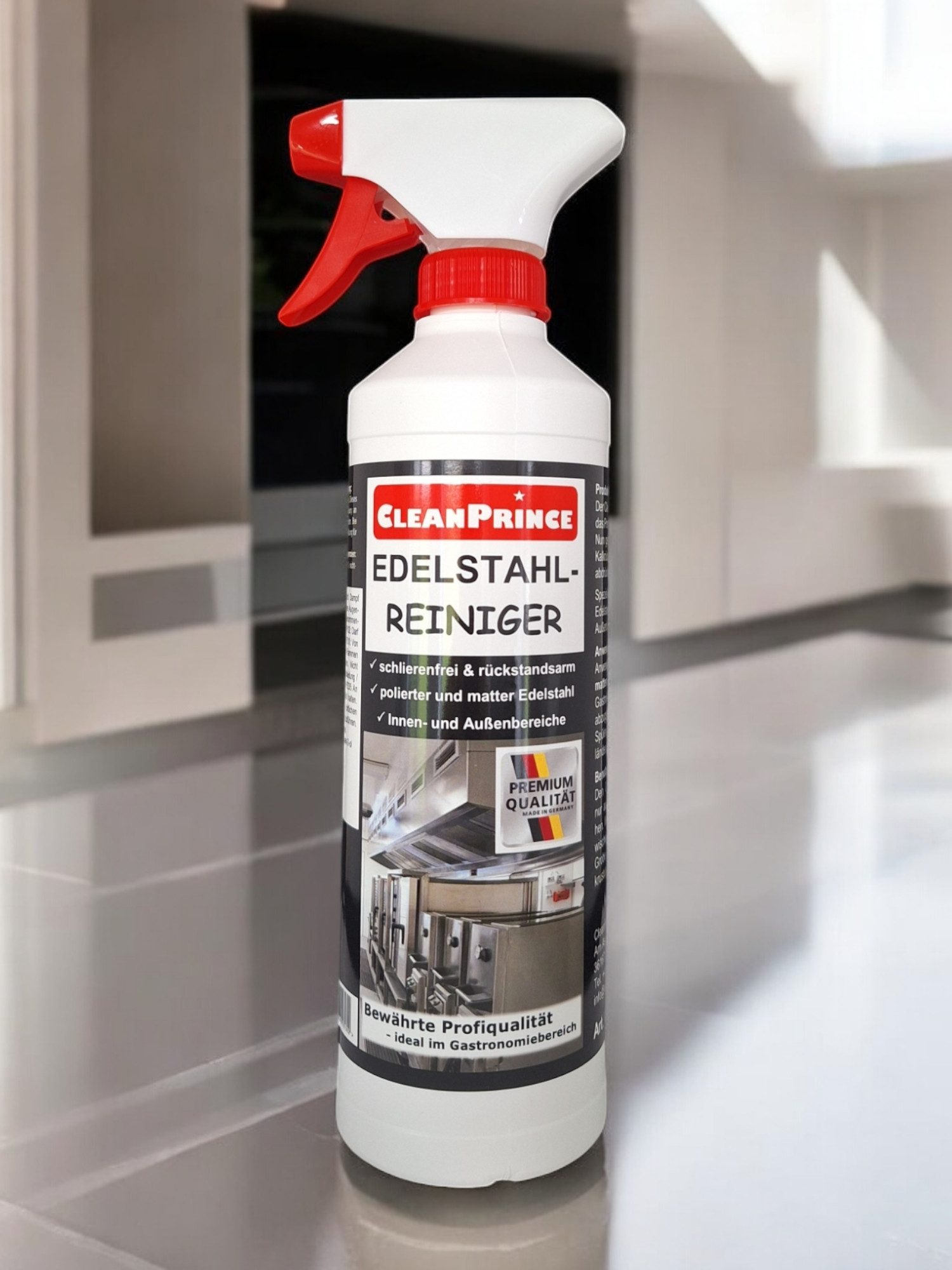 Zubereitungs- und Aufbewahrungshinweise | Anwendbar auf allen polierten und matten Edelstahlflächen wie z. B. Gastroinventar, Kühlschränke, Dunstabzugshauben, Mikrowellengeräte, Spülen, Küchenfronten, Balkongeländer, Handläufe, Briefkästen etc. CleanPrince EDELSTAHL-REINIGER nur auf abgekühlte Flächen aufsprühen, mit einem fusselfreien Tuch abwischen und auspolieren. Grobe Verschmutzungen oder Verkrustungen im Vorfeld entfernen. Darf nicht in die Hände von Kindern gelangen. Dieses Produkt ist grundsätzlich vor der Anwendung an verdeckter Stelle auf Verträglichkeit zu prüfen. Bei sachfremder Anwendung erlischt jegliche Haftung für mögliche Schäden. |