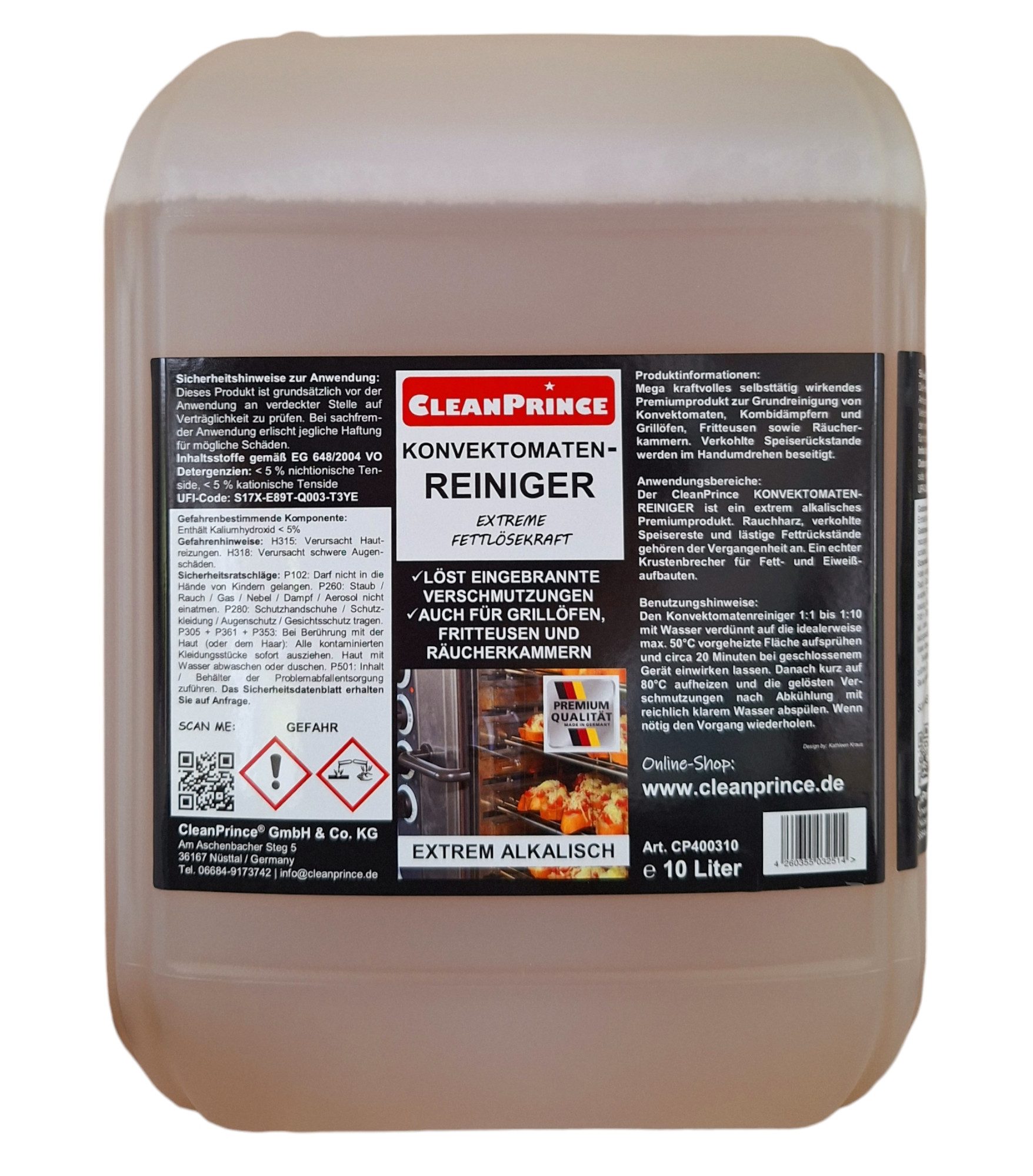 Zubereitungs- und Aufbewahrungshinweise | CleanPrince Konvektomatenreiniger ist ein extrem alkalisches Premiumprodukt. Rauchharz, verkohlte Speisereste und lästige Fettrückstände gehören der Vergangenheit an. Ein echter Krustenbrecher für Fett- und Eiweißaufbauten. Den Konvektomatenreiniger 1:1 bis 1:10 mit Wasser verdünnt auf die idealerweise max. 50°C vorgeheizte Fläche aufsprühen und circa 20 Minuten bei geschlossenem Gerät einwirken lassen. Danach kurz auf 80°C aufheizen und die gelösten Verschmutzungen nach Abkühlung mit reichlich klarem Wasser abspülen. Wenn nötig Vorgang wiederholen. |