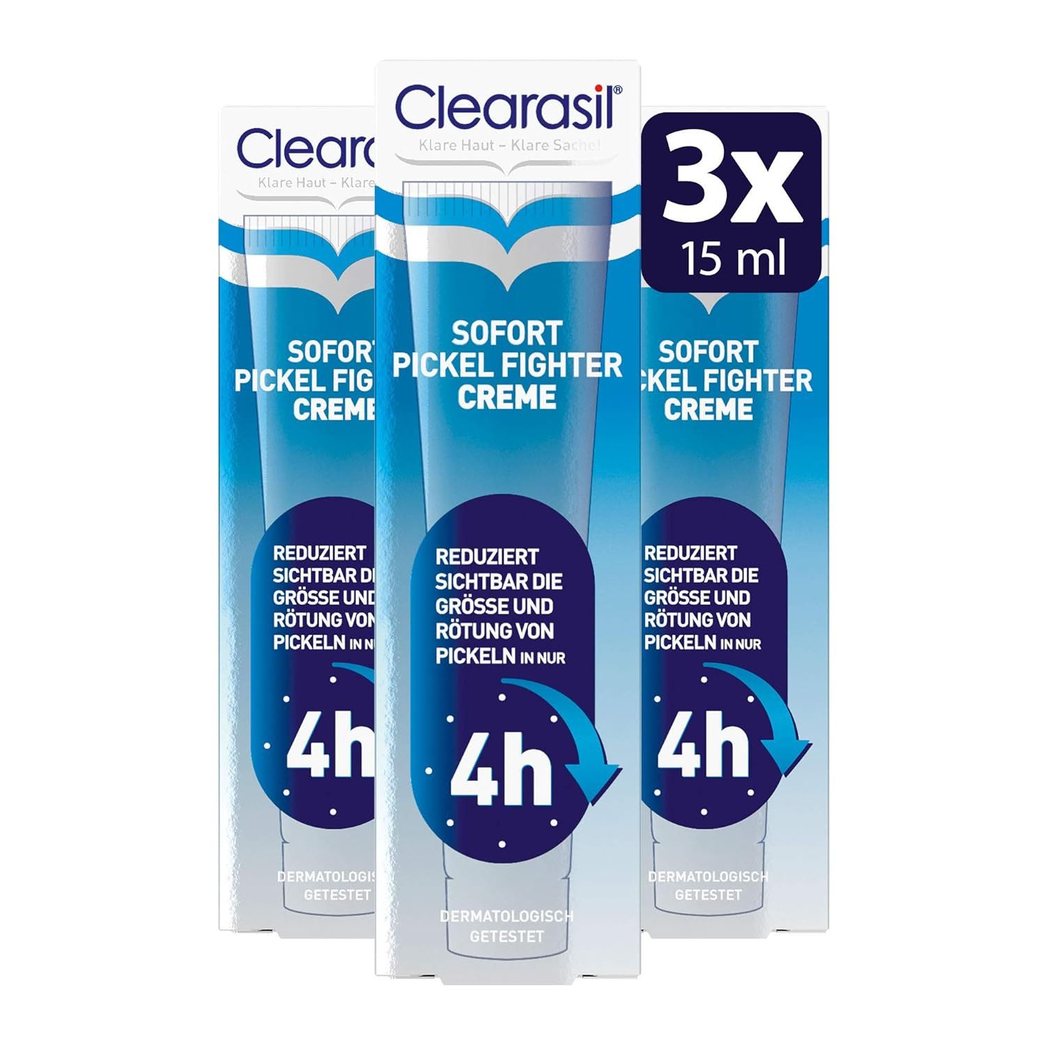 Die Clearasil Sofort Pickel Fighter Creme bietet Soforthilfe bei sichtbaren Pickeln im Gesicht. Die Anti Pickel Creme reduziert sichtbar die Розмір und Rötung von Pickeln und sorgt für reinere Haut in nur 4 Stunden. Die hautklärenden Inhaltsstoffe der Creme gegen Pickel befreien verstopfte Poren, die Unreinheiten wie Pickel und Mitesser verursachen können. Sie dringen tief in die Poren unreiner Haut ein und reduzieren Pickel schnell und gründlich.