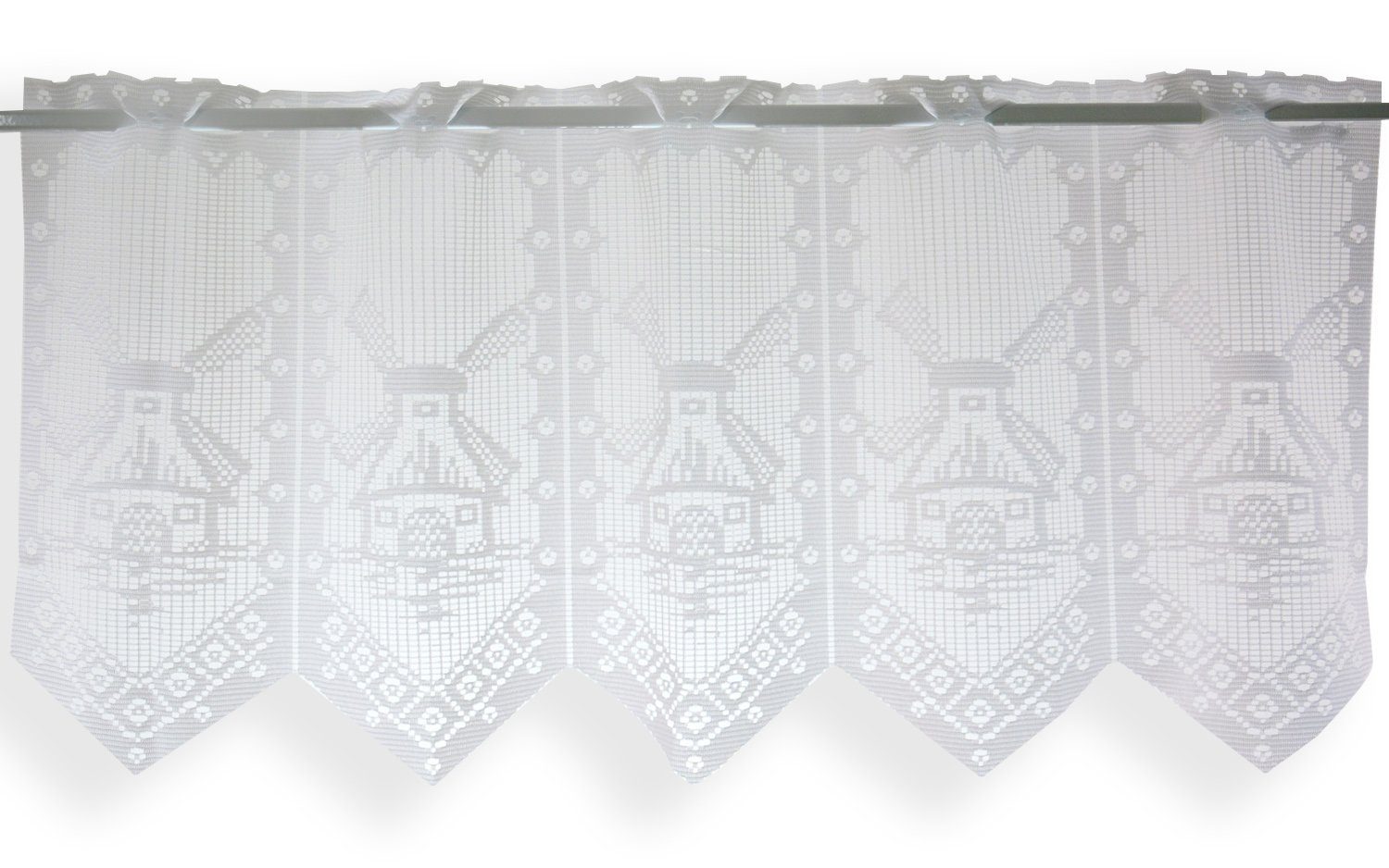 Transparente Scheibengardine Windmühle aus Jaquard gefertigt, grobe Struktur und fester Stoff in weiß. Ein Klassiker und besonders gut für Ihr Küchenfenster geeignet. Dieses schöne Panneaux mit Ösen-Aufhängung, bietet Ihnen einen leichten Sichtschutz: Der untere Teil des Fensters wird verdeckt und hält neugierige Blicke fern und Sie können trotzdem den Ausblick genießen! Das Panneux ist ein Hingucker der aber trotzdem dezent zurückhalten ist.