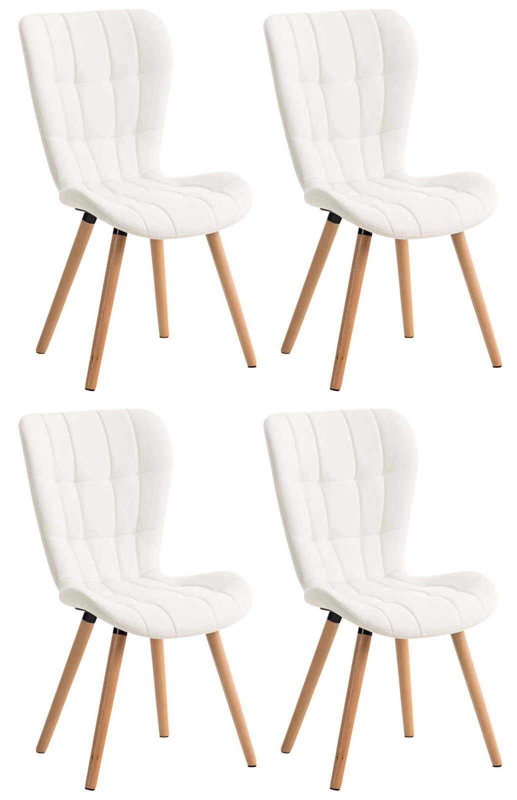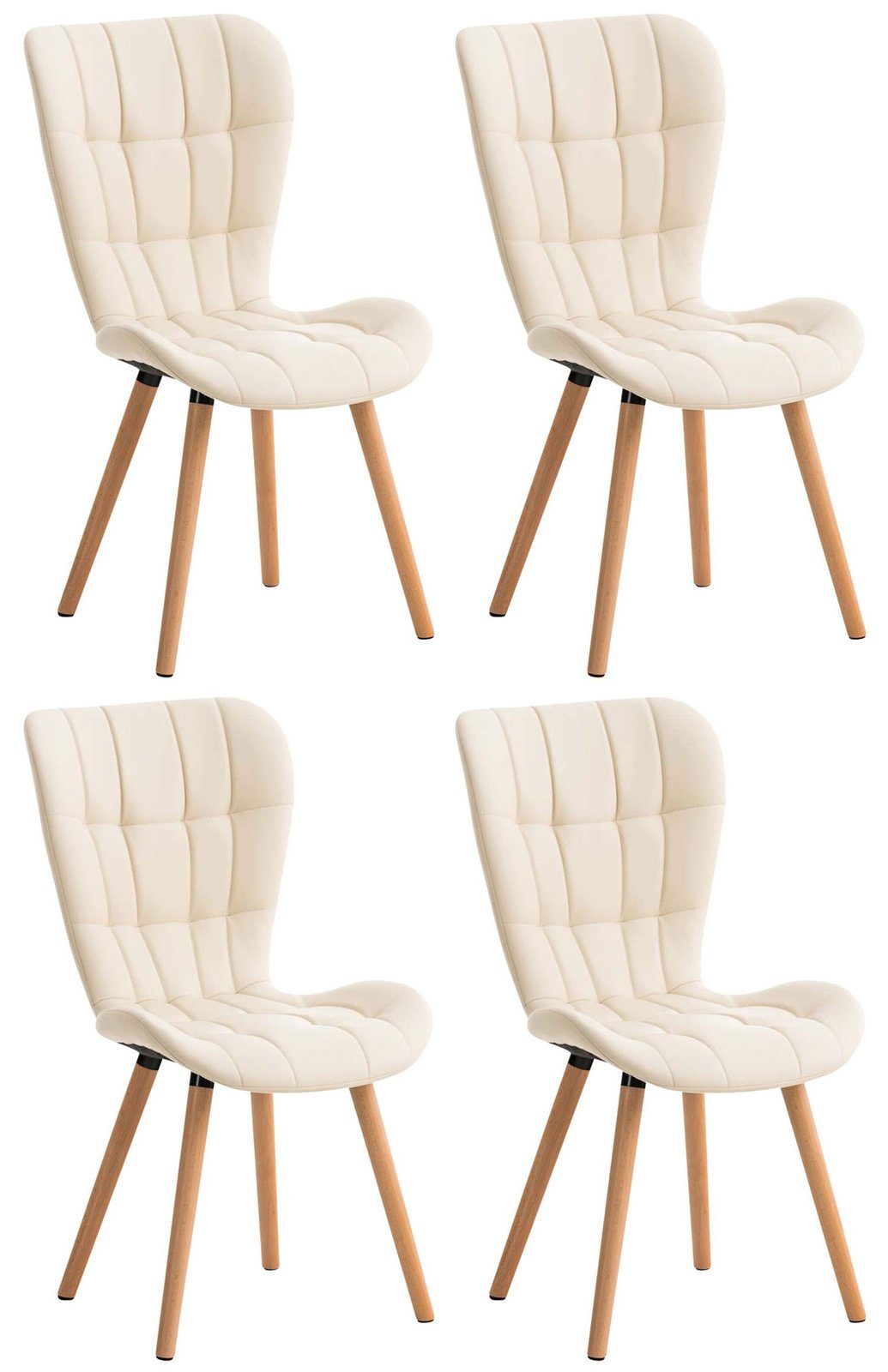 Das 4er Esszimmerstuhl-Set Elda vereint Kunstleder und Holz zu einer stilvollen Sitzkomposition. Dabei präsentiert es sich gut gelaunt in den Farben Blau, Braun, Creme, Gelb, Grau, Grün, Lila, Orange, Pink, Rot, Schwarz und Weiß. Die Sitze der Stühle sind mit einer komfortablen Polsterung und Kunstlederbezügen versehen, so dass sie einen angenehmen Sitzkomfort ermöglichen. Auffallend sind dabei ihre gesteppten Oberflächen mit schönen Ziernähten. Sie werden durch ein modernen 4-Fuß Untergestell ergänzt. Dank der pflegeleichten Materialien lässt sich jeder Esszimmerstuhl leicht reinigen. Bodenschoner unter den Stuhlfüßen schützen den Untergrund vor Kratzern und Spuren.
