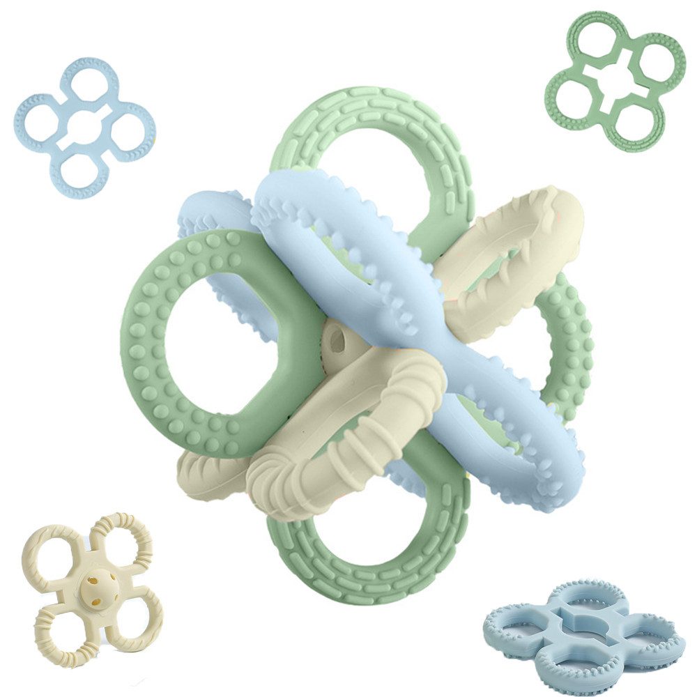MULTI-SITED TEXTURED: Der Beißring kann in 3pcs Ring Beißring mit Multi-Surface Beißung abgenommen werden, macht diesen Beißring perfekt für die Unterstützung beim Ausbruch von Vorder-, Mittel- und Hinterzähnen. Mehrere nagende weiche Berührungspunkte können das Zahnfleisch besser massieren und Schmerzen lindern.