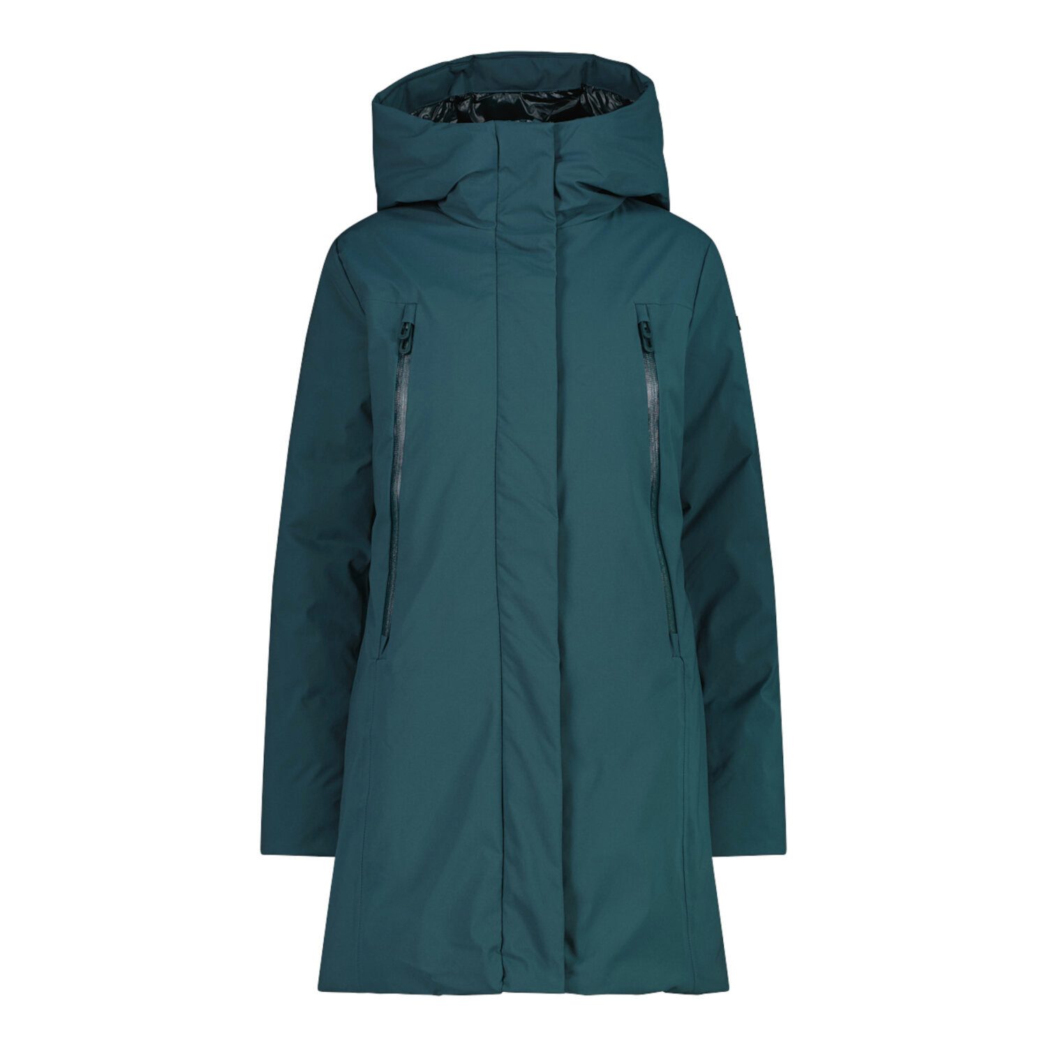 CMP Damen Mantel WOMAN COAT FIX HOOD. Damenmantel mit Kapuze, der in der kalten Jahreszeit Wärme, Schutz und Stil bietet. Die Füllung aus Feel Warm Flock, die aus synthetischen Flockenfasern besteht, garantiert eine hohe Wärmeisolierung, Atmungsaktivität und Wasserbeständigkeit. Die Struktur der Flocken macht das Kleidungsstück leicht, weich und dennoch kompakt und garantiert maximale Bewegungsfreiheit auch an den dynamischsten Tagen. Ausgestattet mit einer Clima-Protect-Membran mit MVP-Index und vollständig versiegelten Nähten bietet es hervorragenden Schutz vor Wind und Regen, hält den Körper trocken und sorgt für gute Atmungsaktivität. Abgerundet wird das Design durch zwei praktische und funktionale Doppeltaschen, die ideal sind, um kleine Gegenstände sicher aufzubewahren. Ein funktionaler und bequemer Mantel, perfekt für alle, die Zuverlässigkeit, Schutz und einen unverzichtbaren Stil in der Stadt und im Freien suchen. Futter: 100% Polyamid. Wattierung: 100% Polyester. Obermaterial: 100% Polyester.