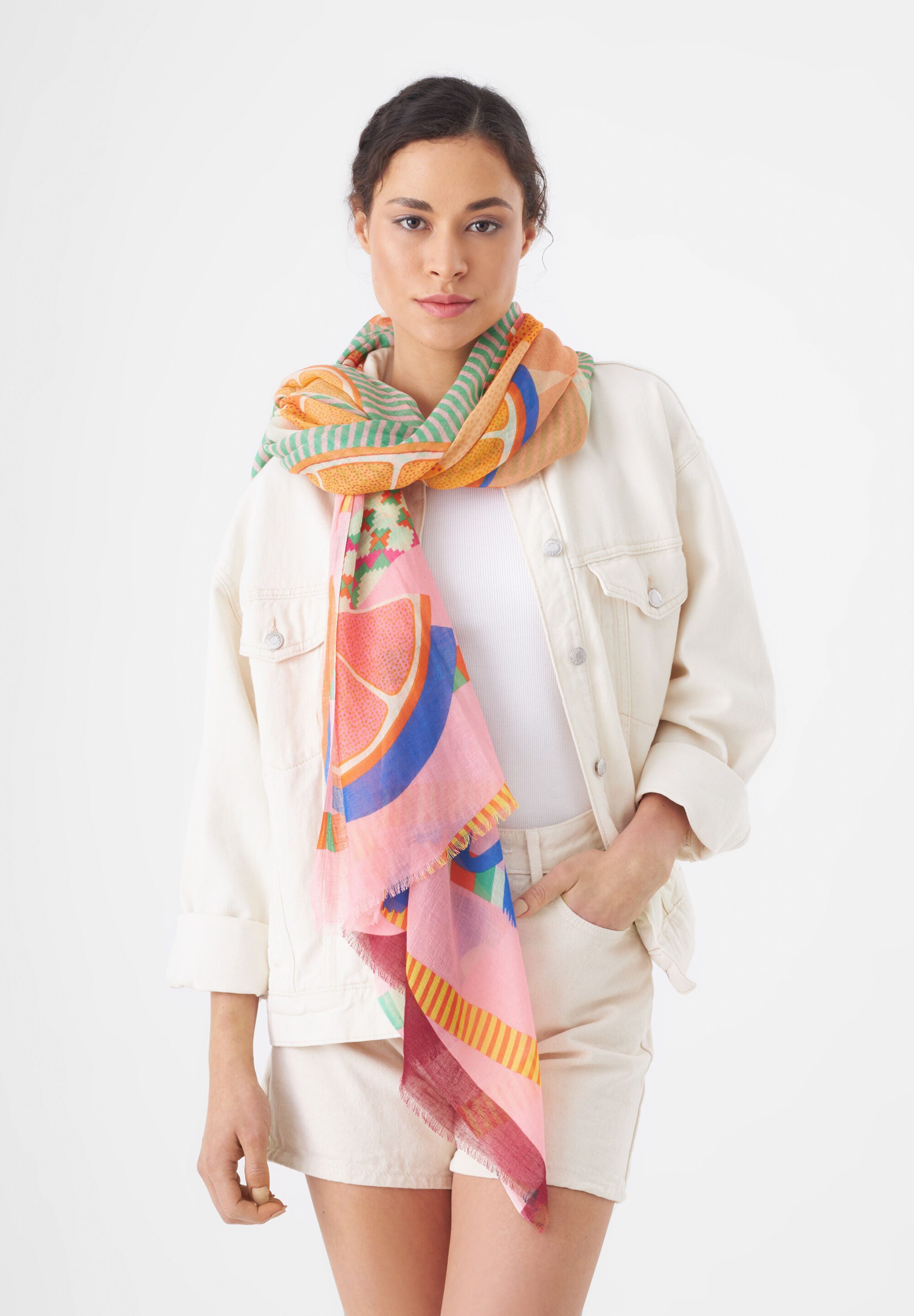 Erfrischende Summer Drinks gibt es nicht nur in deiner Lieblingsbar, sondern auch auf unseren neuen Art School Schals. Dieser leichte und luftige Schal ist ein Must-have für den Sommer. Mit coolem „Spritz“-Print macht er City-Looks und Beach-Outfits zu stylischen Eyecatchern. Der Schal wurde aus einer hochwertigen Materialmischung aus Baumwolle, Modal und Leinen gefertigt, die mit hohem Tragekomfort überzeugt. Sie vereint die Vorzüge der drei Fasern. Leinen steht für eine edle Optik gepaart mit einer kernigen Griffigkeit. Modalfasern geben dem Schal Weichheit. Der Baumwollanteil sorgt für Lässigkeit und Unkompliziertheit. Der natürliche Kühleffekt und die gute Luftdurchlässigkeit machen den Stoff vor allem bei warmen Temperaturen sehr beliebt.