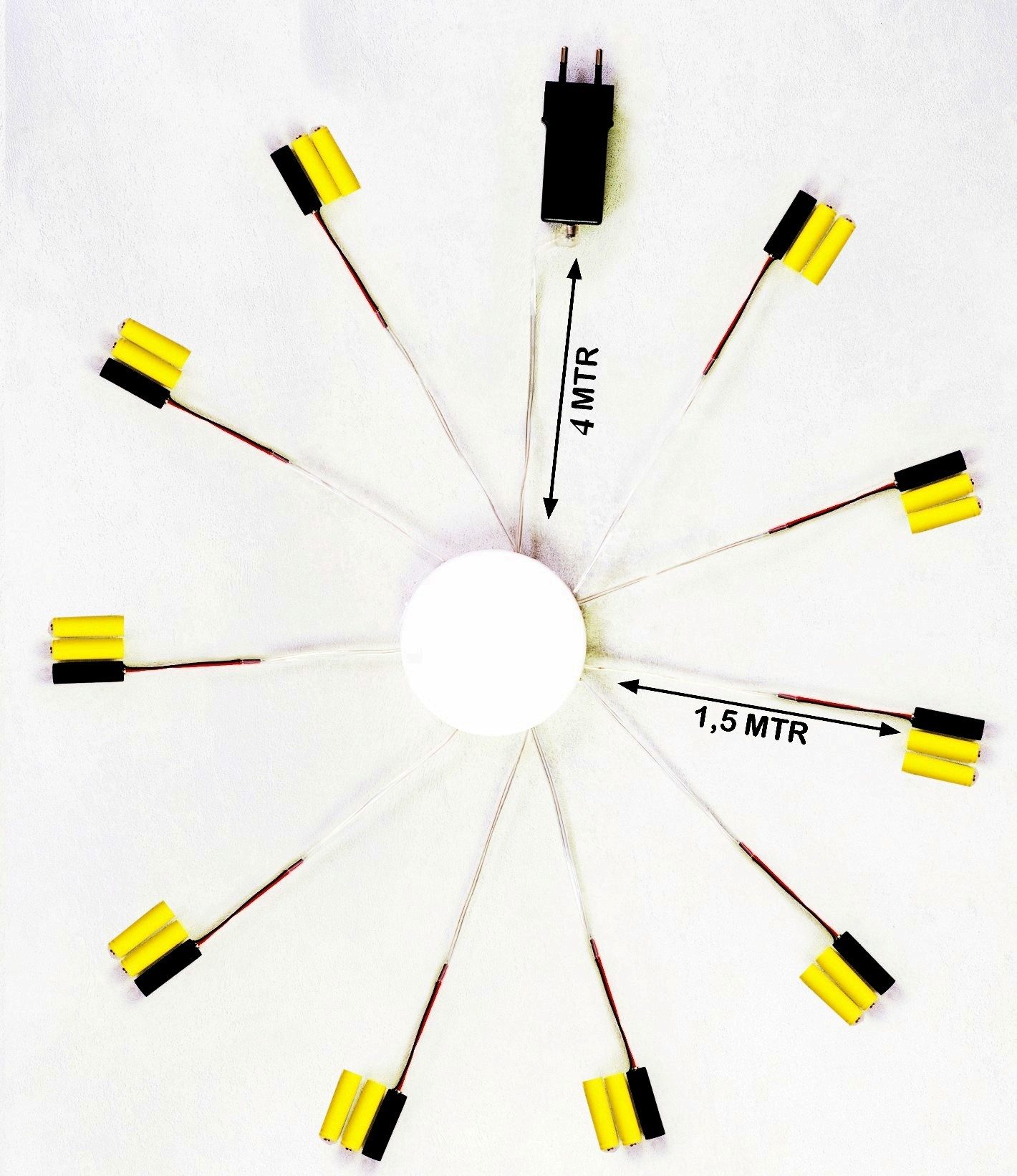 Durch das extrem dünne und flexible Kabel können praktisch alle LED-Geräte, welche über 3 AA Zellen versorgt werden, problemlos und ohne Modifikationen direkt mit einem Netzteil verbunden werden. Die Довжина der jeweiligen Kabel/Stränge (10x) vom Verteiler zum "Endgerät" beträgt ca. 1,50 m. Zusätzlich gibt es 4 m Zuleitungskabel bis zum Netzteil. Genügend Platz um das "Gerät" optimal platzieren zu können.